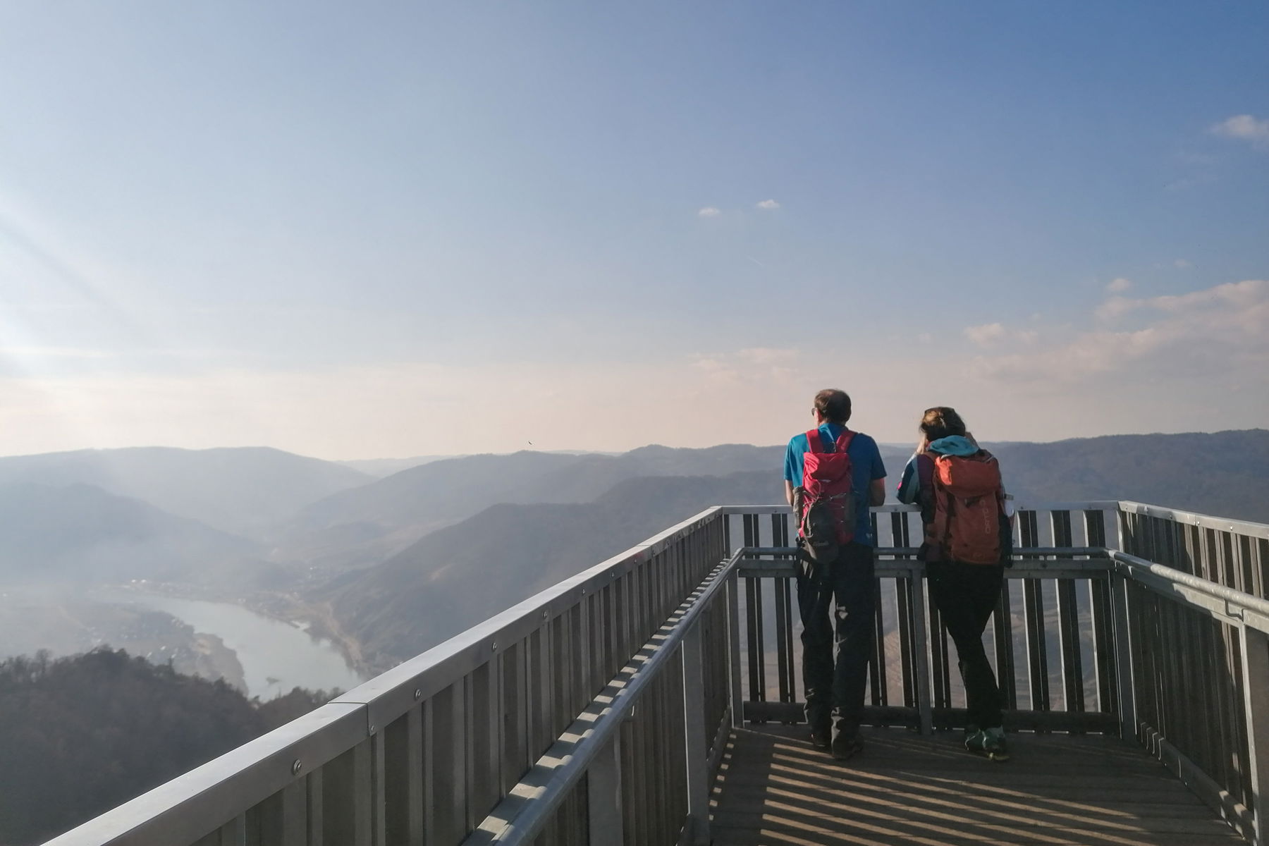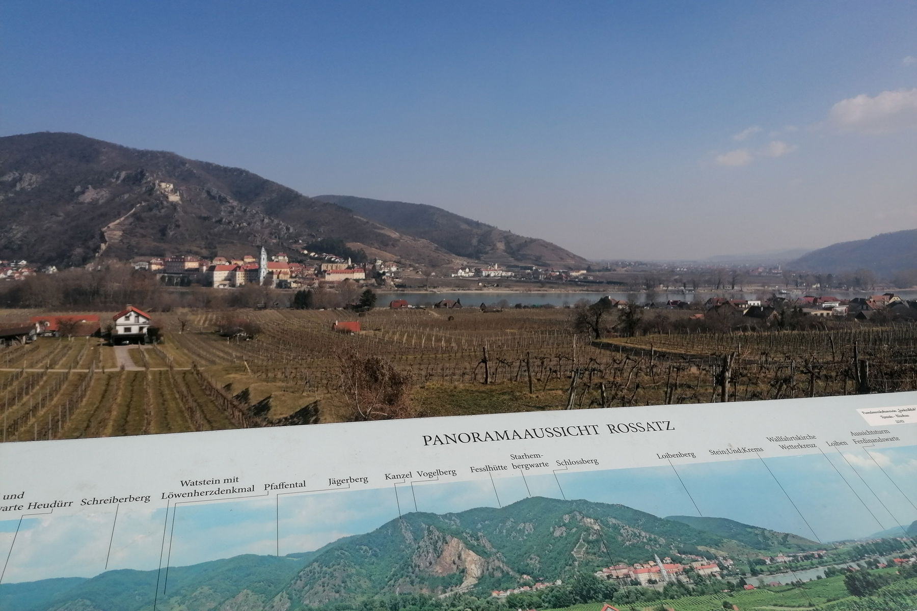 Ich mühe mich den doch steilen Anstieg nach oben, freue mich gleichzeitig auf die Aussicht. Und die ist tatsächlich sehr schön und reicht bis weit hinunter an die Donau und die Orte in der Wachau. Die kann ich leider nicht benennen, aber das macht ja nix.