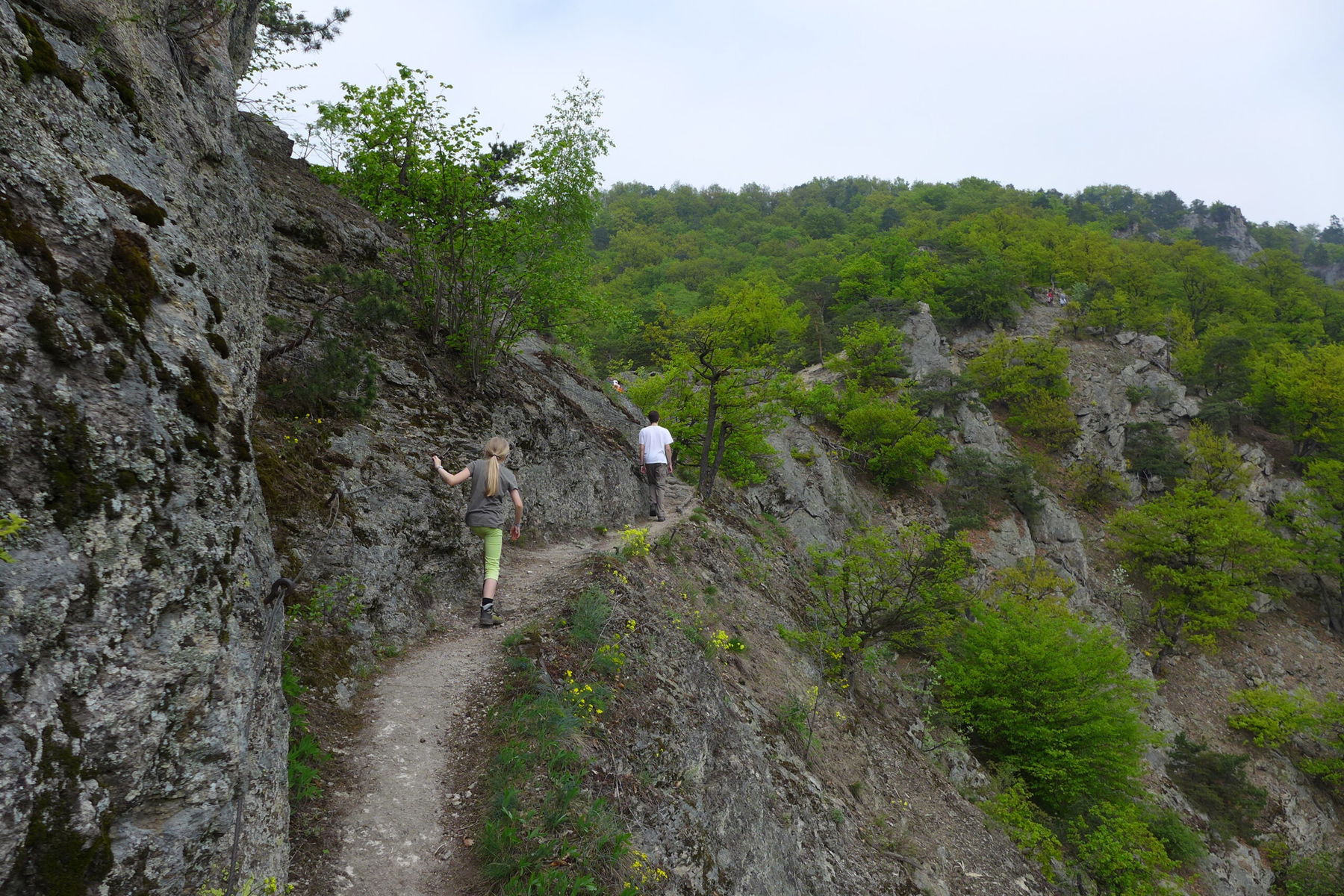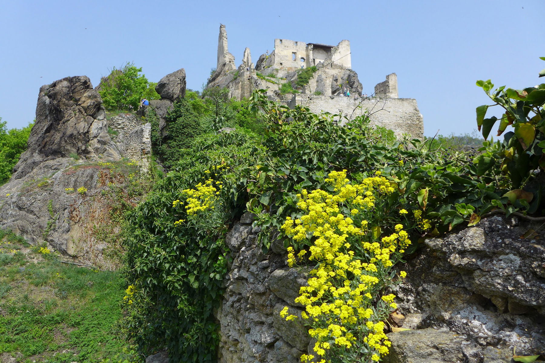 Vom Bushalt Dürnstein/Parkplatz P2 in den Ort und durch den mittelalterlichen Ortskern. Beim Gästehaus Stöger rechts Richtung Vogelbergsteig. Über die Bahn (Vorsicht!) und steil zu den letzten Häusern. Dann hinein in den lauschigen Talgraben (erste Felsformationen) und zu einer Gabelung. Links mit roter Markierung zu einem Steinschlagnetz. Danach zunehmend gute Ausblicke auf Dürnstein und zu den Klettertürmen. Auf dem Vogelbergsteig mithilfe eines einfachen Handlaufs eine abschüssige Flanke queren und am Grat weiter zu einer Gabelung (lohnender Abstecher nach links sanft abwärts zur nahen Dürnsteiner Kanzel (lilafarbene Markierung). Weiter mit rot Übergang Richtung Starhembergwarte. Vorbei an der Fesslhütte und hinauf zur kleinen Warte mit feiner Aussicht in die Wachauer Nähe und alpine Ferne. Nach Süden auf Steiglein über den Eichenwaldrücken (verblasste grüne Markierung) und rechts querend zu einem besseren Steig. Weiter zu den ersten Felstürmen und zur Burgruinenanlage (sehenswerter Rundgang). Auf dem Eselsteig hinab nach Dürnstein, links durch das Steiner Tor und rechts an der Stadtmauer entlang zur Donaufähre.