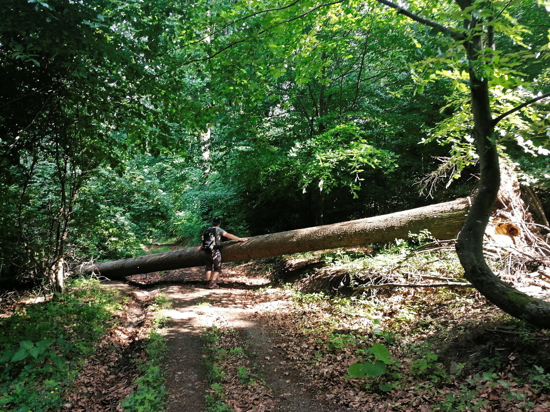 Bei der ersten Kreuzung mit dem Welterbesteig geht es von der Asphaltstraße weg rechts in zahlreichen Kehren in den Wald hinein und auf den Atzberg hinauf. Es ist heiß und Mittag (Achtung – Nachteil für Langschläfer*innen im Sommer!) und wir kommen nur langsam voran. Das macht aber auch gar nichts, schließlich ist Sonntag.