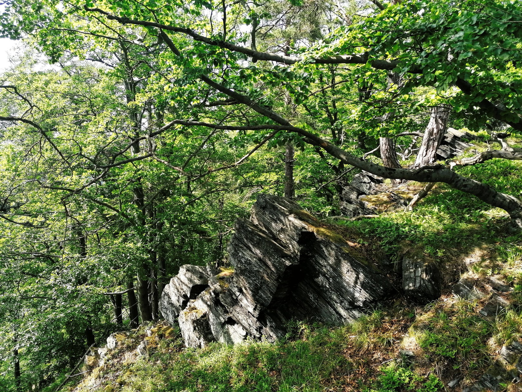 Pause machen wir trotzdem, bevor wir dem Weg weiter bergauf folgen, er ist teilweise sehr schmal. Durchs Gebüsch kommt man dann auf einen breiteren Fahrweg, ab jetzt geht es flacher weiter, die steilsten Passagen haben wir offenbar geschafft. Dass die Markierung nicht gut sei – wie uns der Kompass-Führer warnt – können wir nicht bestätigen. Wenn man die Augen offenhält, ist die gelbe Markierung durchgehend gut zu sehen. Die Waldstücke sind wirklich sehr schön, Ausblick null, dafür entdecken wir allerlei Schönes: Walderdbeeren (köstlich!), spannende Baumformationen (ungewöhnlich viele entwurzelte Bäume, weniger schön!), dichte Holunderwälder (auch hier können wir nicht widerstehen) und immer wieder den Wachauer Fels.