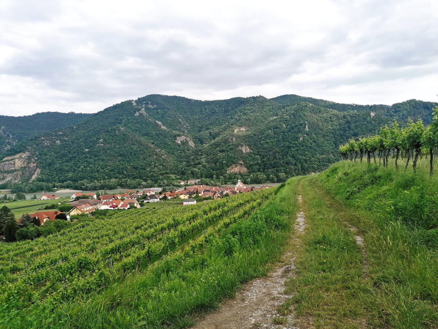 Das letzte Stück geht durch die Weinberge bis in den Ort Wösendorf, wo uns gleich die ersten Heurigen entgegenlachen.