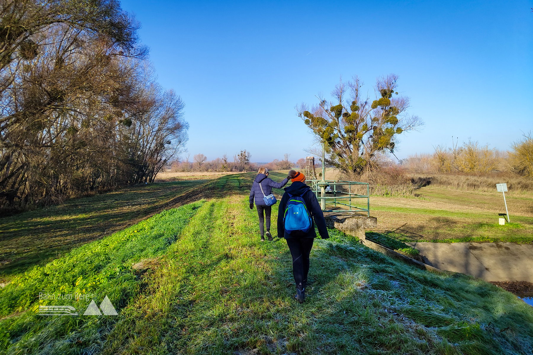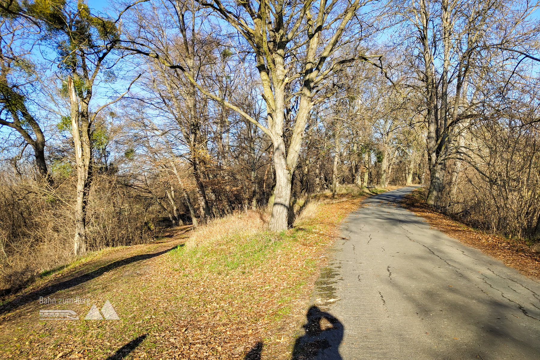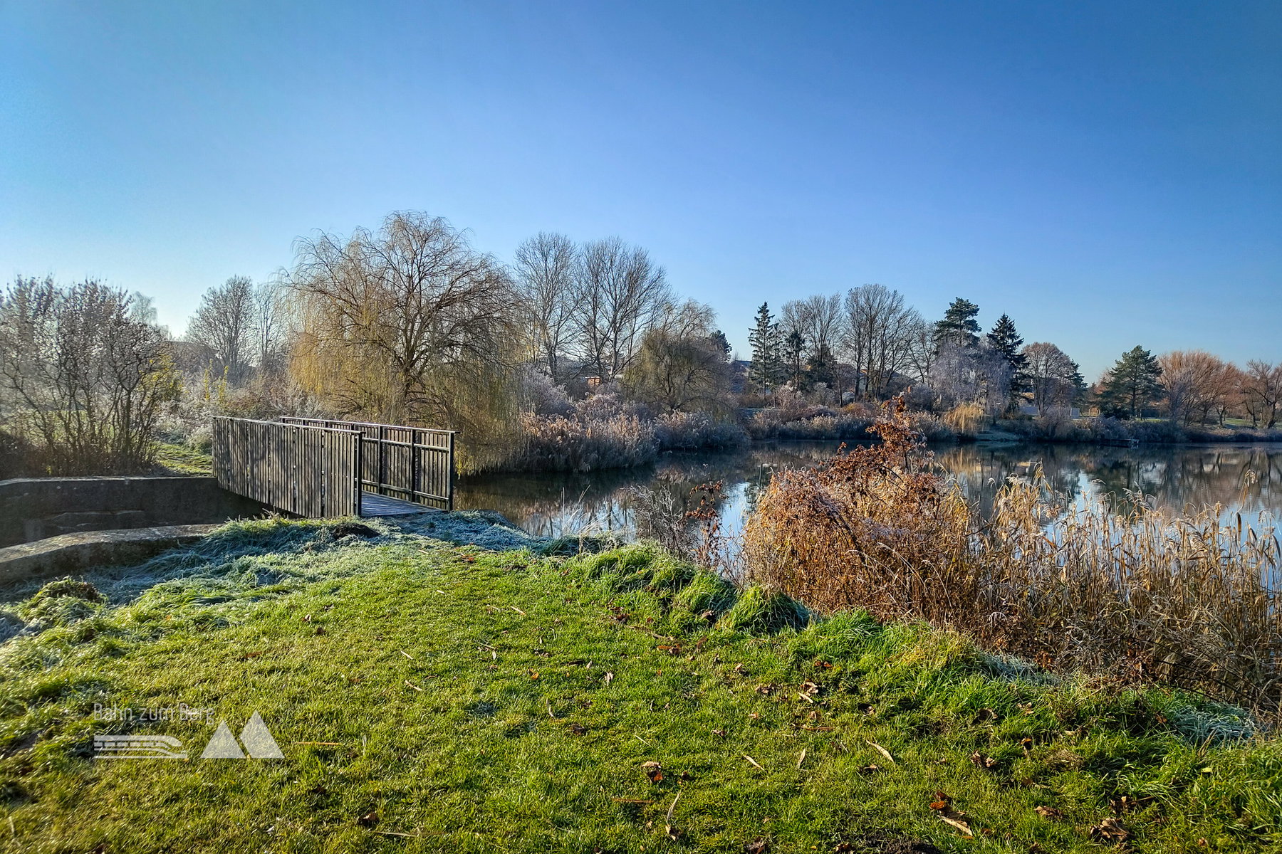 Wir gehen bis zum Ende des Bahnsteigs, dann auf einem Weg neben den abgezäunten Schienen weiter. Nachdem man die Hauptstraße überquert, erreicht man das Ufer des Bernhardsthaler Teiches. Der Bernhardsthaler Teich, der in der Mitte von einer historischen Eisenbahnbrücke getrennt wird, ist die größte Wasserfläche des Weinviertels.