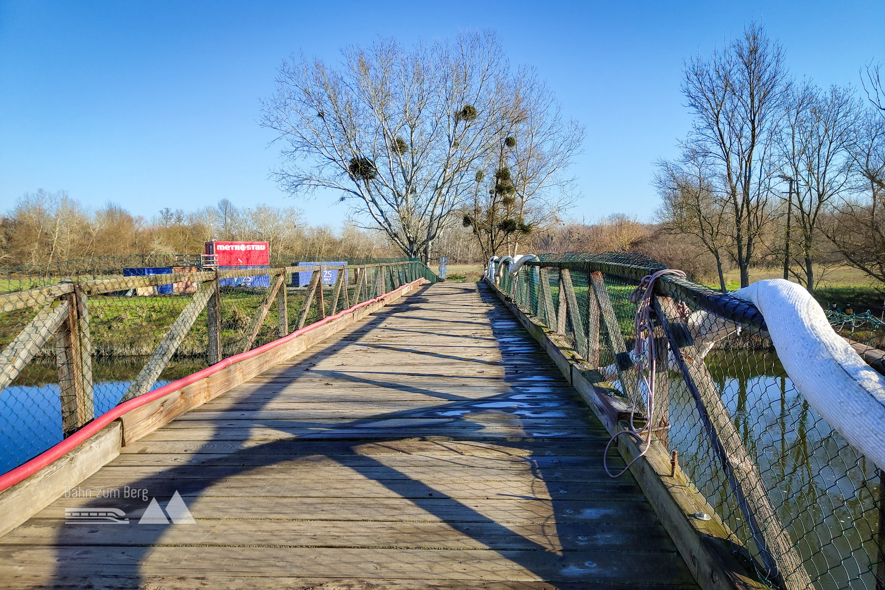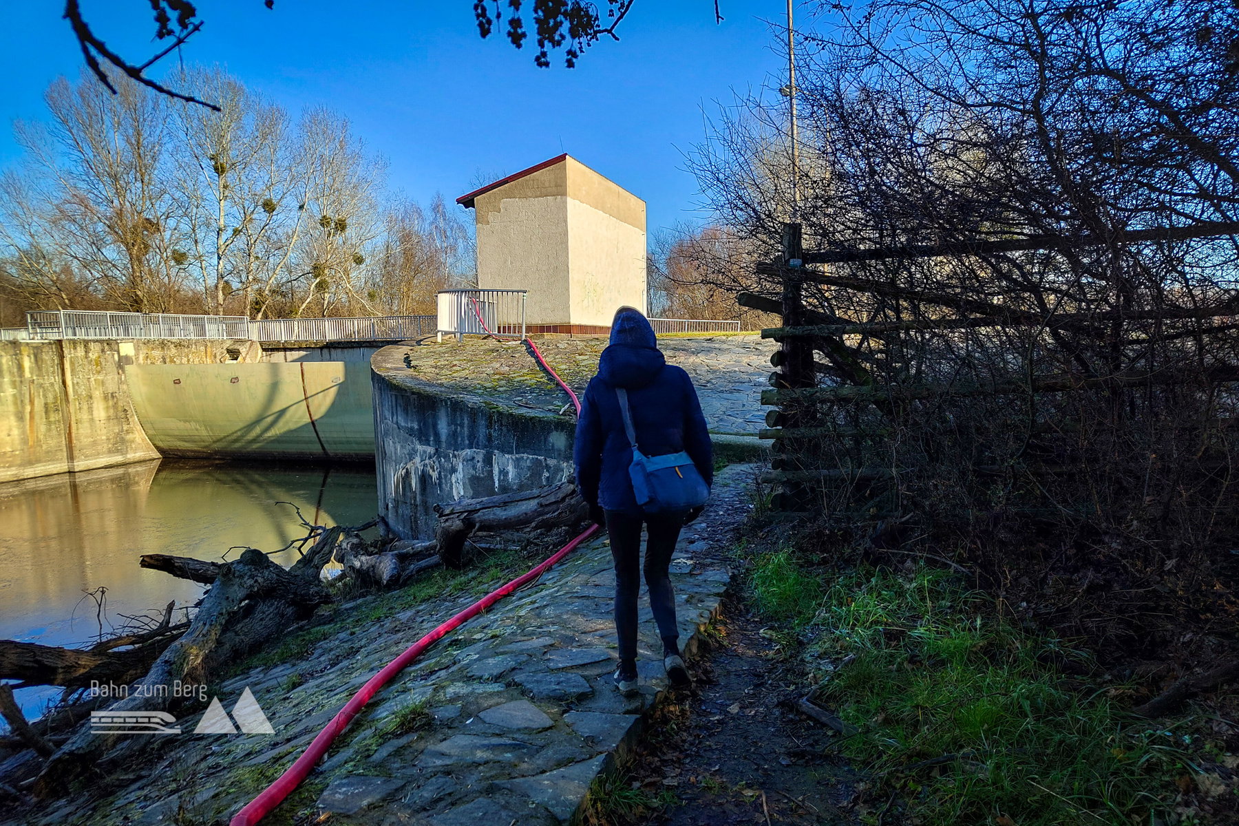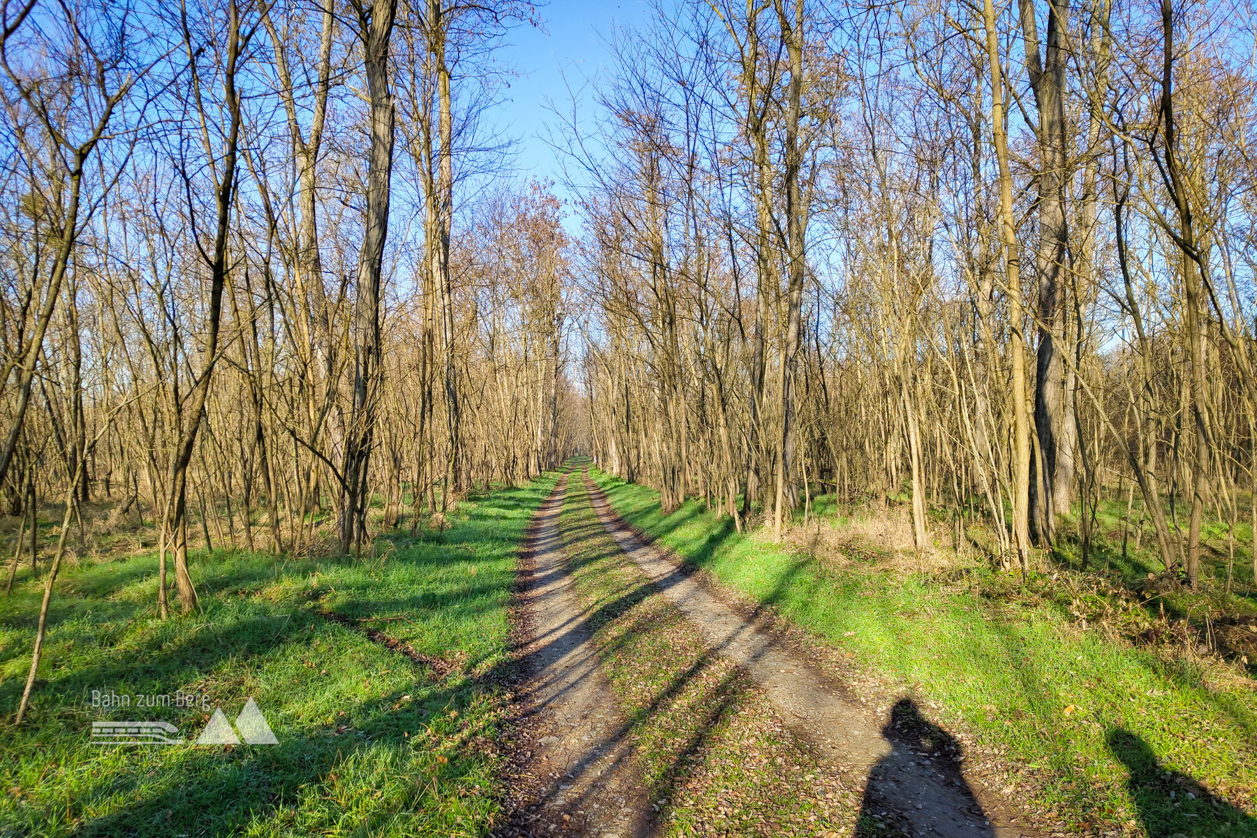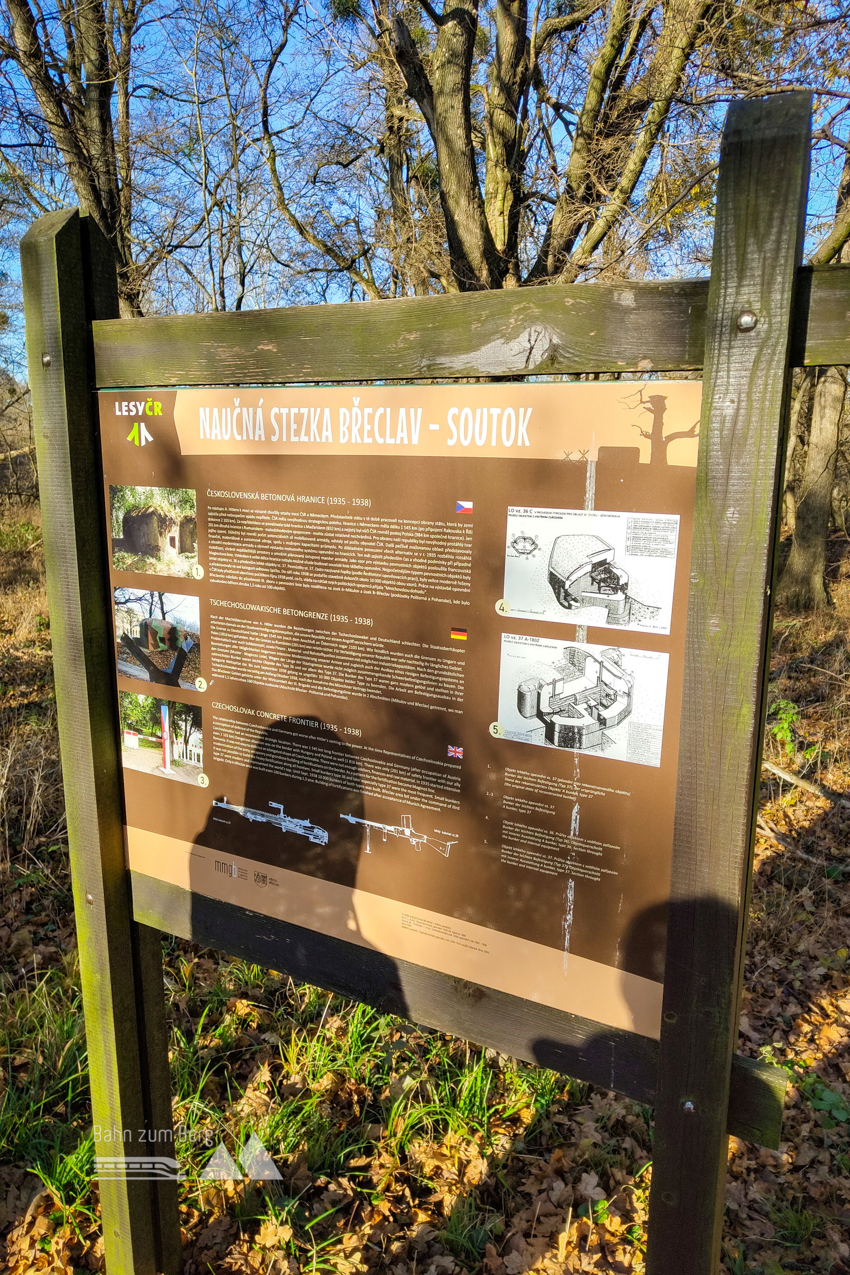 Wir gehen bis zum Ende des Bahnsteigs, dann auf einem Weg neben den abgezäunten Schienen weiter. Nachdem man die Hauptstraße überquert, erreicht man das Ufer des Bernhardsthaler Teiches. Der Bernhardsthaler Teich, der in der Mitte von einer historischen Eisenbahnbrücke getrennt wird, ist die größte Wasserfläche des Weinviertels.