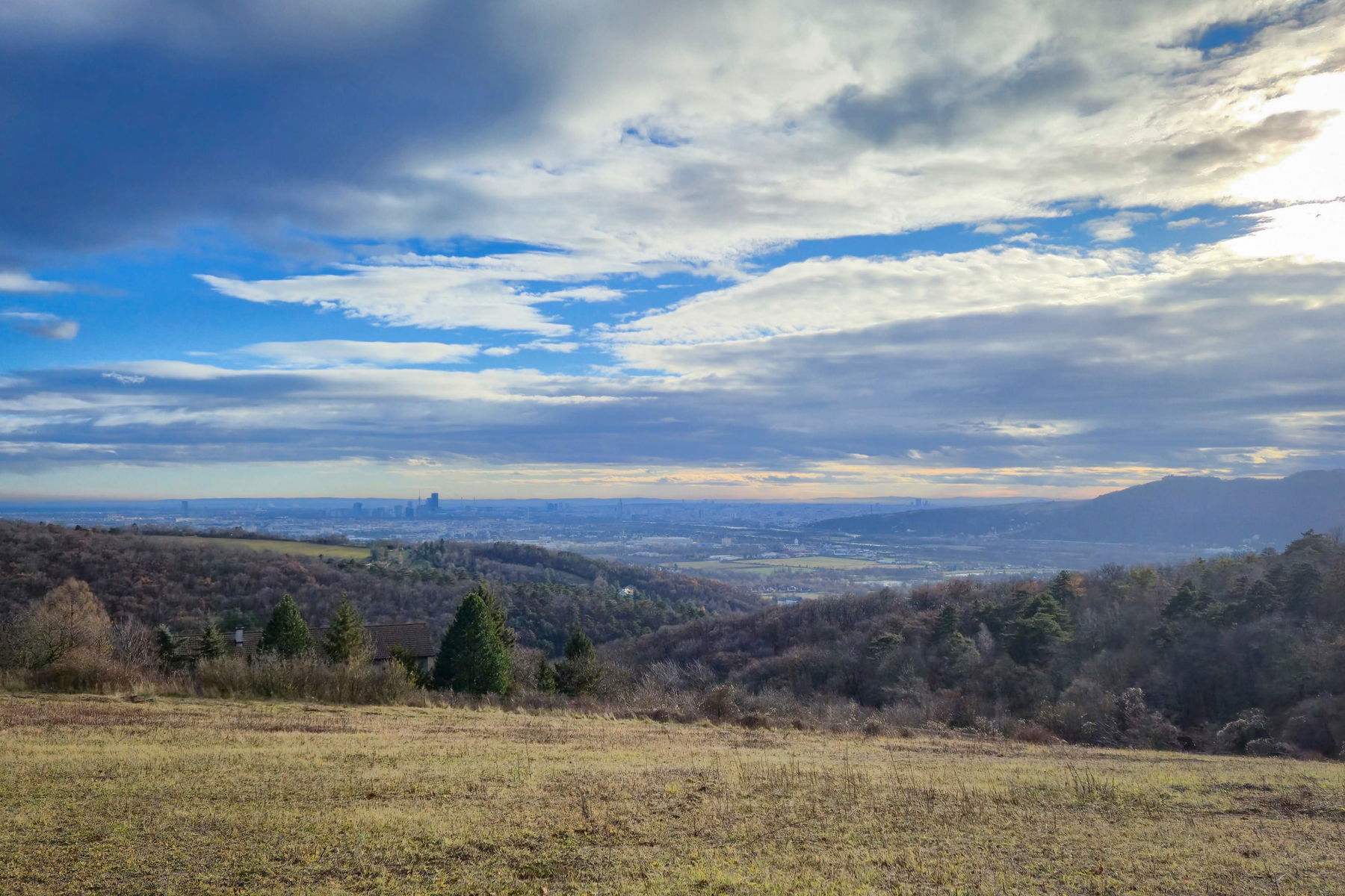 Nach knapp 20 Minuten erreichen wir das Gasthaus Gamshöhe, eine sehr gute Einkehrmöglichkeit mit gutem Essen. Vom Gasthaus geht es eigentlich gleich wieder nach links einen Weg hinein (Pfeil zur Gamshöhe) und kurz danach (vor einem Gartenzaun) leicht rechts hinauf auf einen Pfad. Diesem Pfad folgen wir zur Gamshöhe und genießen am Fuße der Wiese nochmal den Ausblick nach Wien. Nach kurzer Zeit landen wir wieder auf einem breiteren Weg, welchen wir nach links folgen. Es geht vorbei am Waldspaziergang und langsam bergab nach Langenzersdorf über den Wienersteig (etwas steiler). Nach knapp 30 Minuten Abstieg kommen wir im Ort Langenzersdorf an.