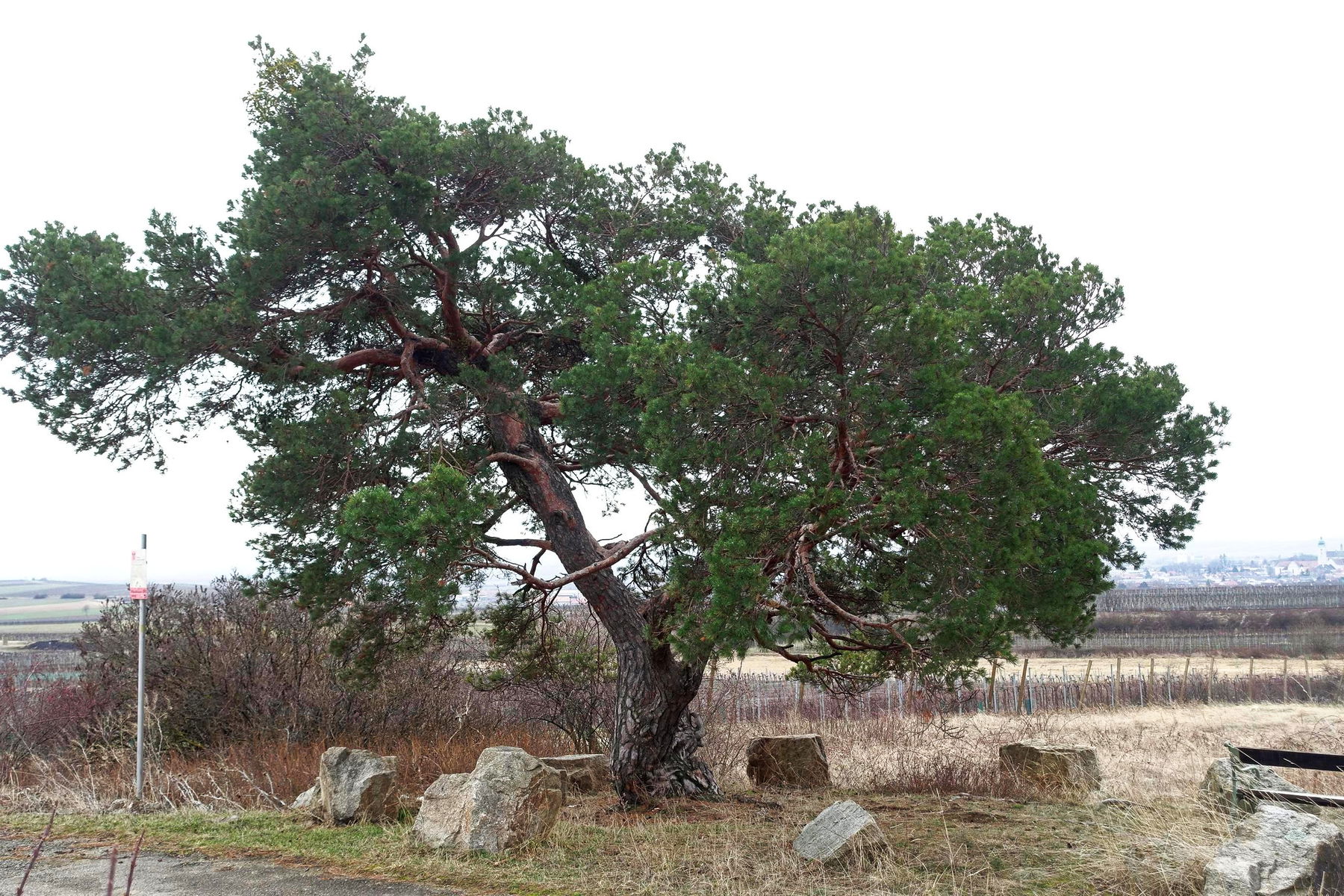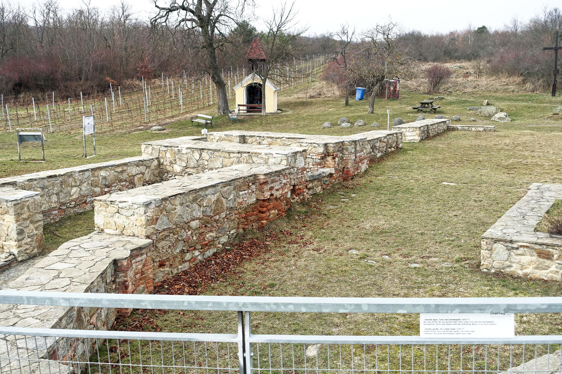 Die gelbe Markierung nach Znojmo ist nicht immer zu entdecken, z.B. sollte man bei Kilometer 1,5 (auffälliger gelber „Thomermarter“) links abbiegen. Eine Navigationshilfe kann nicht schaden, aber mehrere Varianten führen schließlich zum „Heiligen Stein“ bei Oberretzbach. Dieser Kraftplatz mit schöner Aussicht mit einem alten Kultstein, einer Kapelle und den rekonstruierten Grundmauern einer gotischen Kirche bietet sich zum Rasten an.