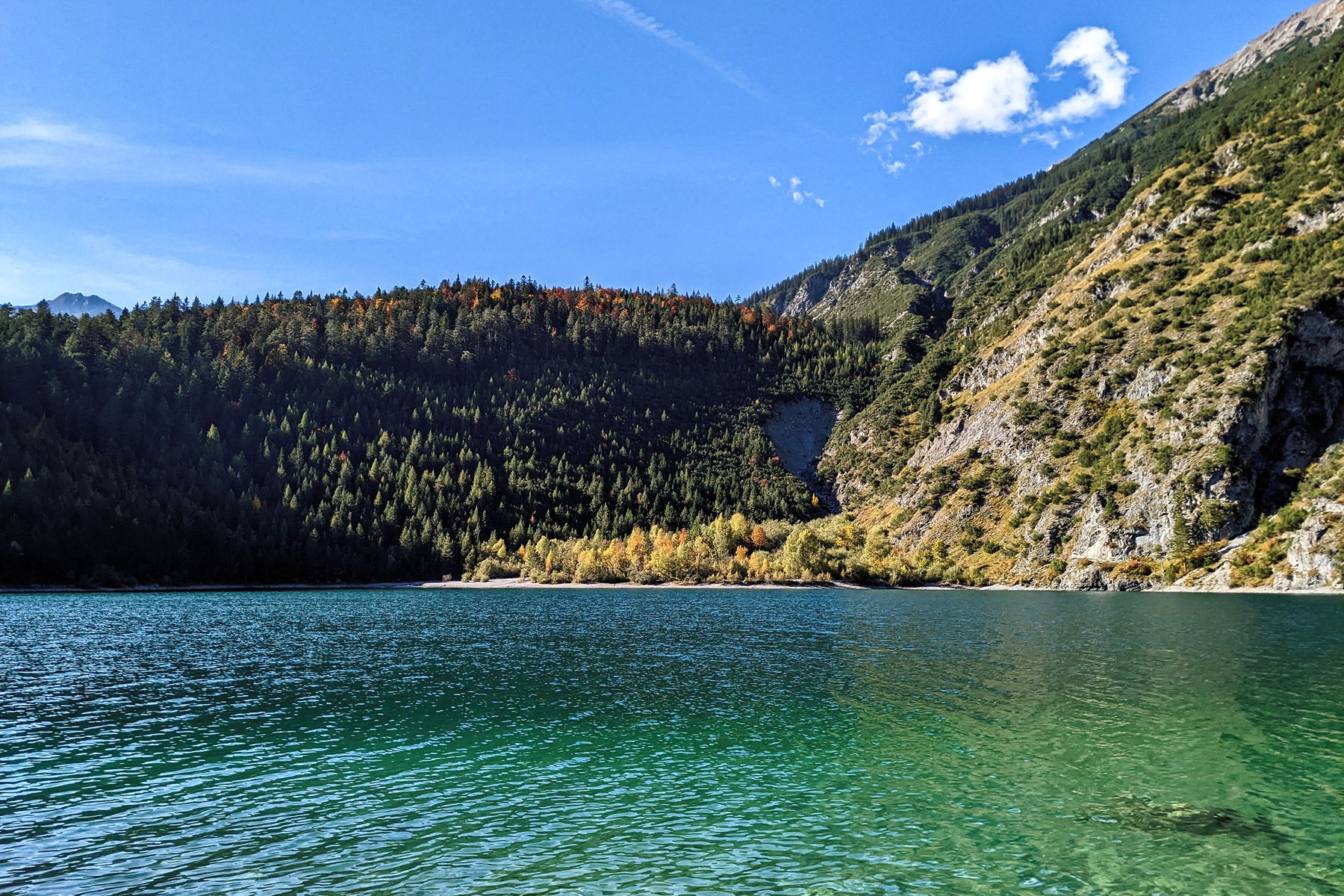 Am See angekommen wählen wir den langen Weg rings herum und biegen rechts ab. Linkerhand würde man am Fuß des Berghanges entlang spazieren, definitiv auch sehenswert! Über einen schmalen Spazierweg gehen wir jetzt, mit ein paar Metern Entfernung zum Wasser, dem Ufer entlang. Ab und an bietet sich ein Abstecher zu einer flachen Stelle am Südufer an. Vereinzelt lesen wir dort ein Schild, dass “an diesem Ufer” Baden verboten ist. Denn der See ist in Privatbesitz vom Lermooser „Hotel MOHR life resort“, wo man sich Tauch- und Fischlizenzen holen kann.