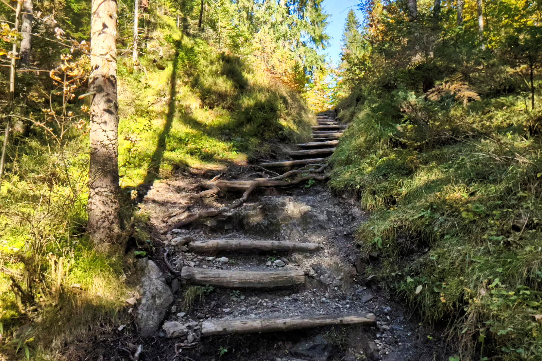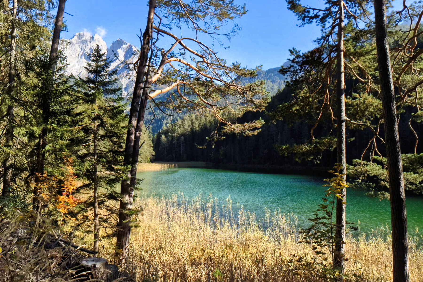 Obwohl in Privatbesitz, ist dieser See ein Naturjuwel, da stört auch die Passstraße hinter den Bäumen nicht! So genießen wir nicht ganz eine Stunde lang den Rundweg, ohne allzu vielen Menschen zu begegnen. Am Parkplatz auf der Nordseite des Sees wenden wir der Herbstsonne den Rücken zu, nachdem wir sie auf den Kiesstränden noch reichlich genossen haben. Vom nördlichsten Punkt des Blindsees zweigt ein Weg ab, der uns zum nächsten Naturjuwel führen soll, dem Mittersee!