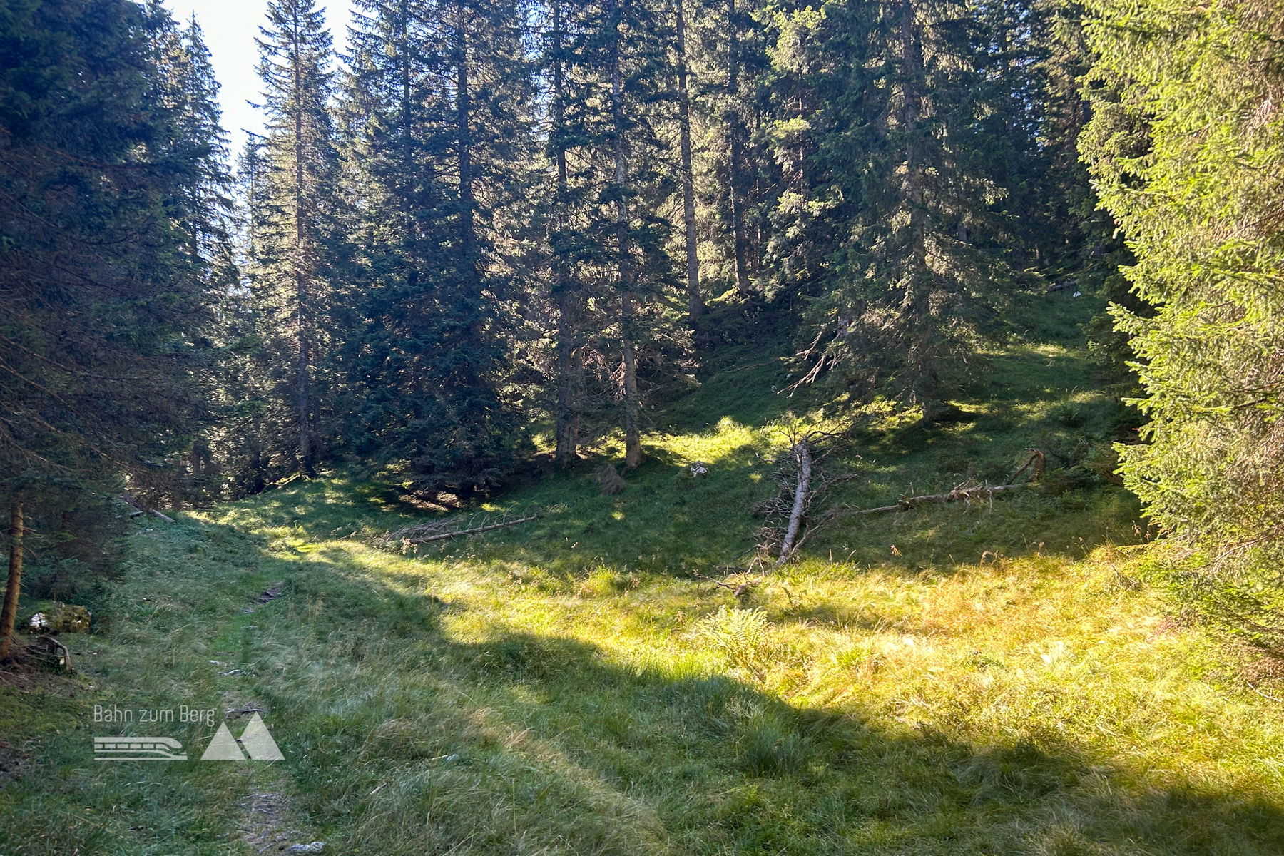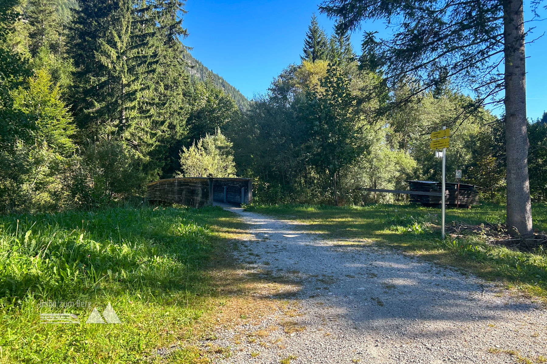 Nach der Haltestelle neben dem Gh Brücke wandert man einige Meter zurück in die Richtung, aus der man von Mittenwald heraufgekommen ist. Wenn man links eine Schottereinfahrt mit einer Brücke dahinter erspäht, biegt man ab. Der rauschende Bach bringt etwas Schwung in das morgentliche Gemüt. Nach der Brücke steigt der Weg gemächlich steiler an, sodass der Kreislauf genügen Zeit hat sich auf die kommenden Strapazen einzustellen.