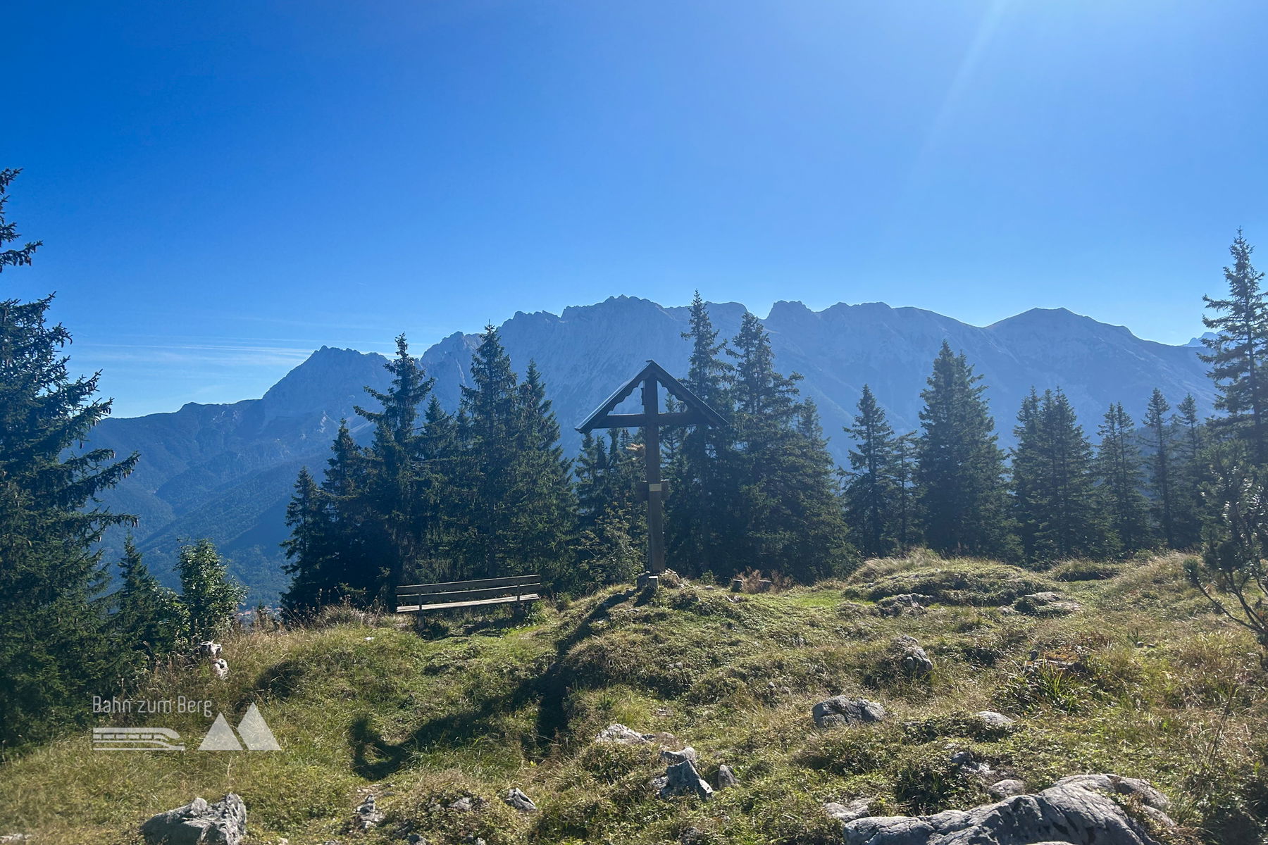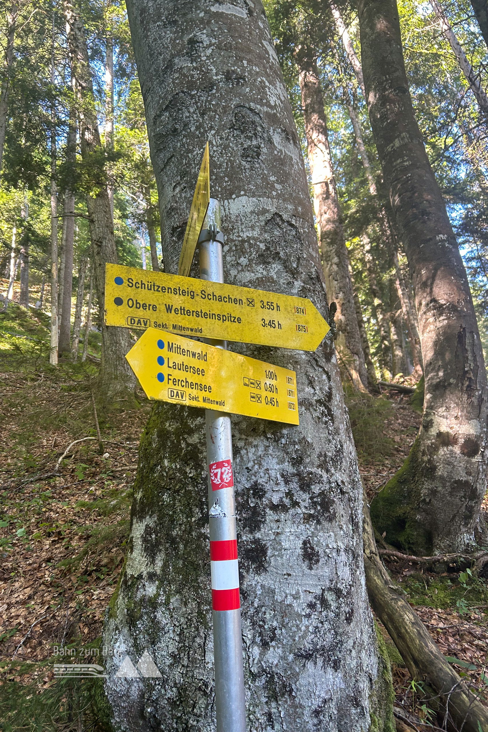 Am ersten Höhepunkt der heutigen Überschreitung lässt sich kurz am warmen Stein in der Sonne verweilen und das erste bisschen Nahrung und Flüssigkeit zu sich nehmen. Danach geht es kurz wieder in den Abstieg Richtung Ferchensee hinunter. Bei folgender Weggabelung aufpassen und den richtigen Weg mit Nummer 875 auf die Obere Wettersteinspitze wählen. Ab dem Wegweiser geht es auch wieder bergauf. Zuerst durch hohen Mischwald, dann lichter werdenden niedrigen Laubwald bis man schließlich auf die für die Kalkalpen charakteristischen Latschen stößt. Mit jedem Höhenmeter nach oben entfaltet sich ein Panorama, das seinesgleichen sucht.