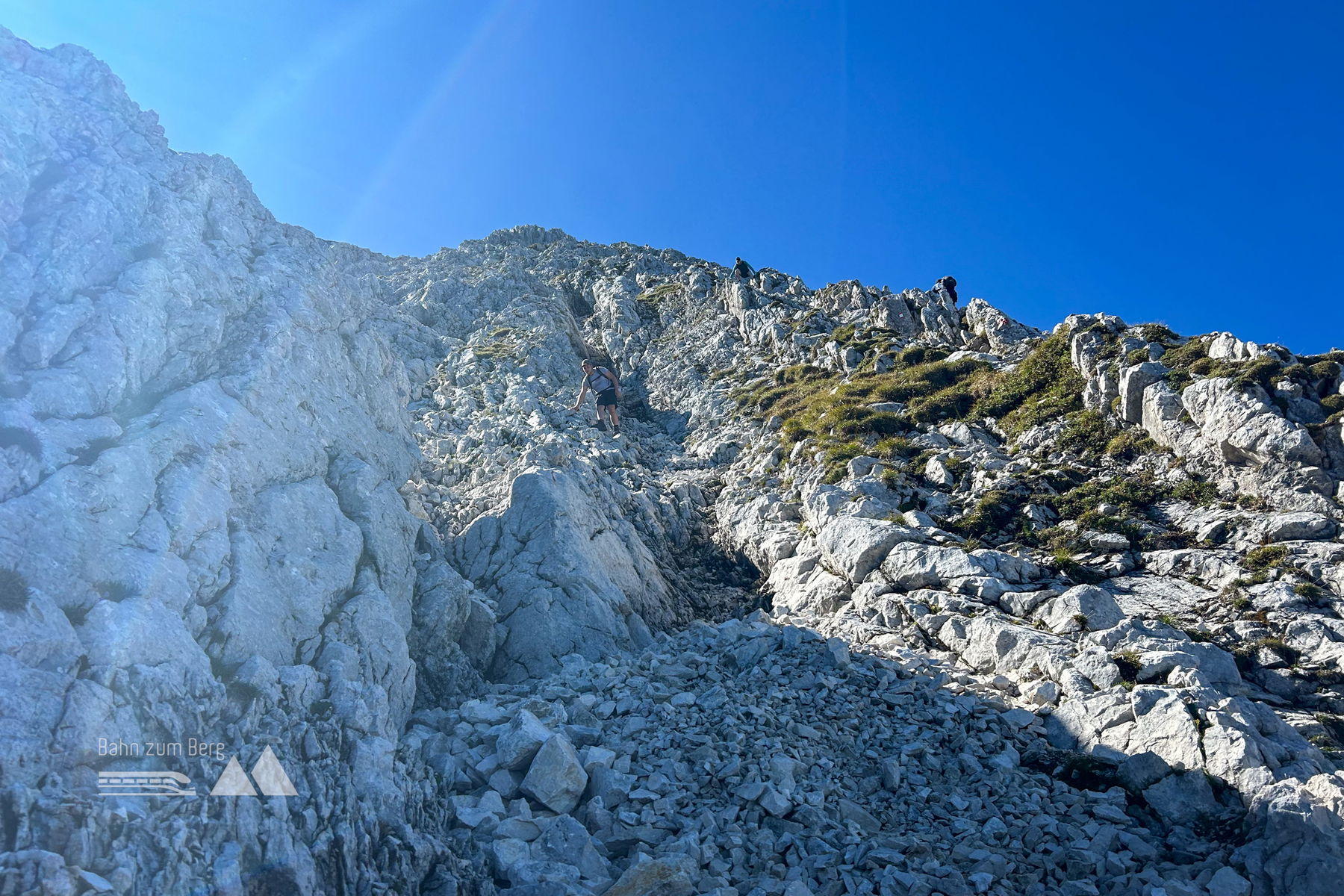 Der Aufstieg beinhaltet einige kniffligere Kletterpassagen im 1. Schwierigkeitsgrad. Eine schon recht weit unten nach einer Schotterreiße im Latschenwald. Dann folgt eine kurz vor dem Grasplateau im Nordhang des Gipfelaufbaus. Kurz vor dem Gipfel muss man schließlich eine länger Klettereinlage durchhalten. Doch sehr ausgesetzt ist dieser Weg nicht, auch das Gestein ist für Kalk relativ stabil. Bald ist der höchste Punkt der Tour erreicht. Die Aussicht raubt einem kurz den Atem (oder war das der letzte steile, zu kraxelnde Anstieg?). Von hier aus hat man an klaren Tagen ein wunderbares Panorama in die Bergwelt in alle Himmelsrichtungen. Man sollte hier kurz sitzen bleiben und die Welt unter sich vorbeiziehen zu lassen. Eine wohlverdiente Brotzeit rundet das Erlebnis ab.