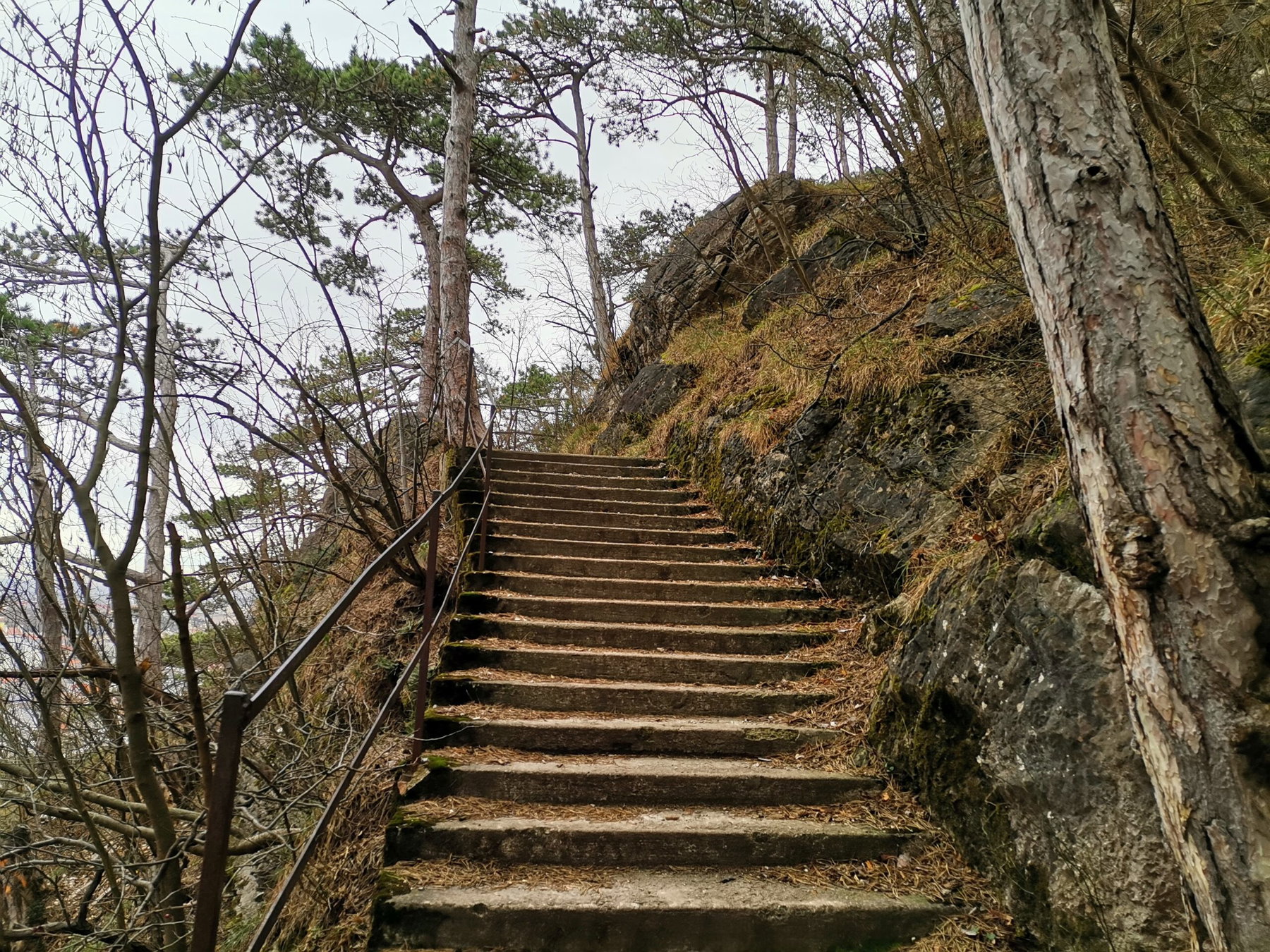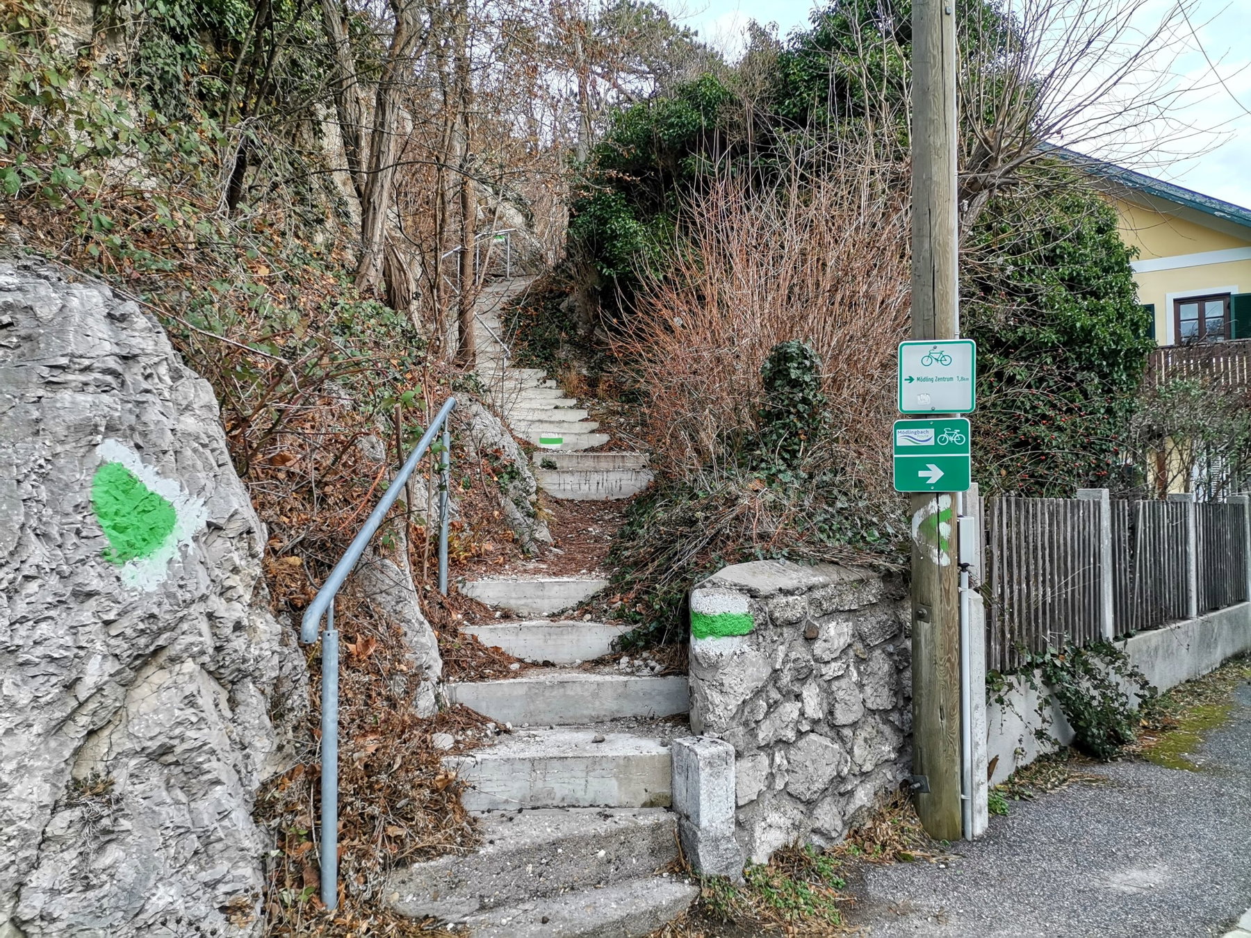 Nach dem Aquädukt steige ich über hübsch angelegte Spazierwege, eher links haltend, in den Wald hinauf und quere dann entlang des Berges bis zur Goldenen Stiege und dem Gasthof Bockerl.