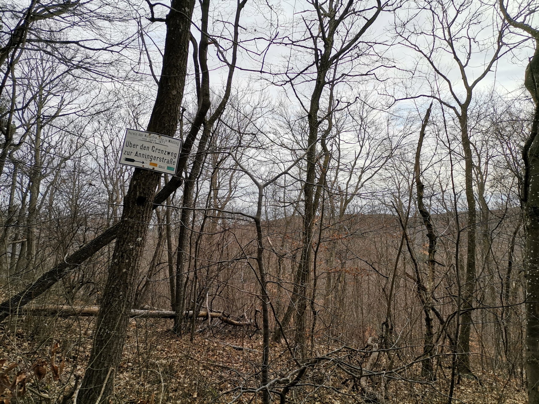 Bei der nächsten Kreuzung, an der scharf links wieder ein Graben zum Unteren 3-Stundenweg führt und es rechts zurück auf den Grenzweg ginge, biege ich „leicht“ links ab. Markierungen findet gibt es auch hier keine. Den Pfad zum Gipfel des Alexandrabergs finde ich in einer Rechtskurve des Oberen 3-Stundenwegs, rechts ein wenig steiler nach oben. Auf der anderen Seite des Gipfelchens wieder retour zum Oberen 3-Stundenweg.