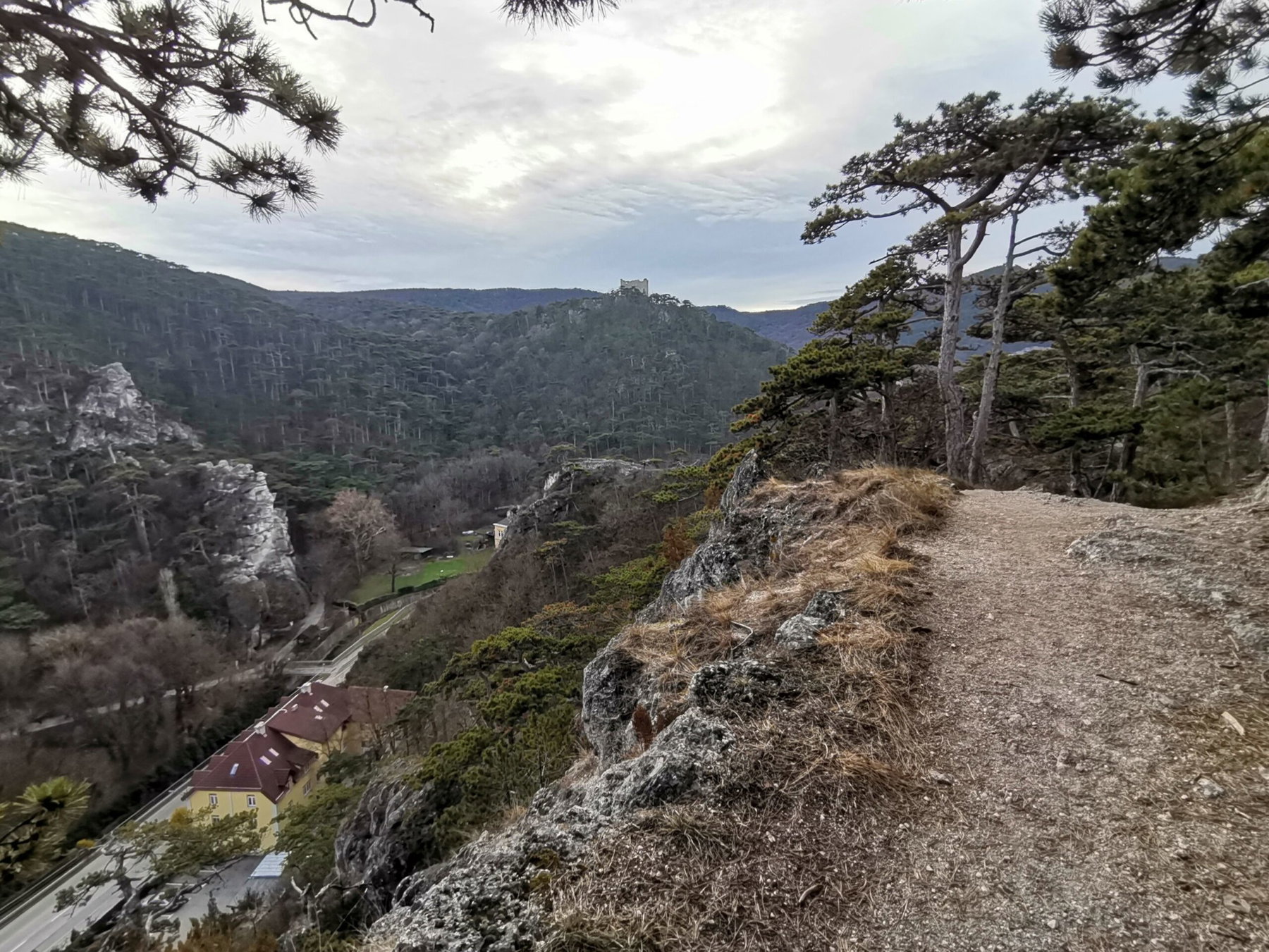 Der Zaunweg oder Gamseckersteig ist ein wirklich hübsch angelegter Spazierweg mit herrlicher Aussicht auf die Burg Mödling und Mödling selbst (Titelbild). Auch den Mödlinger Klettersteig auf der anderen Seite der Klause, kann ich entdecken.
