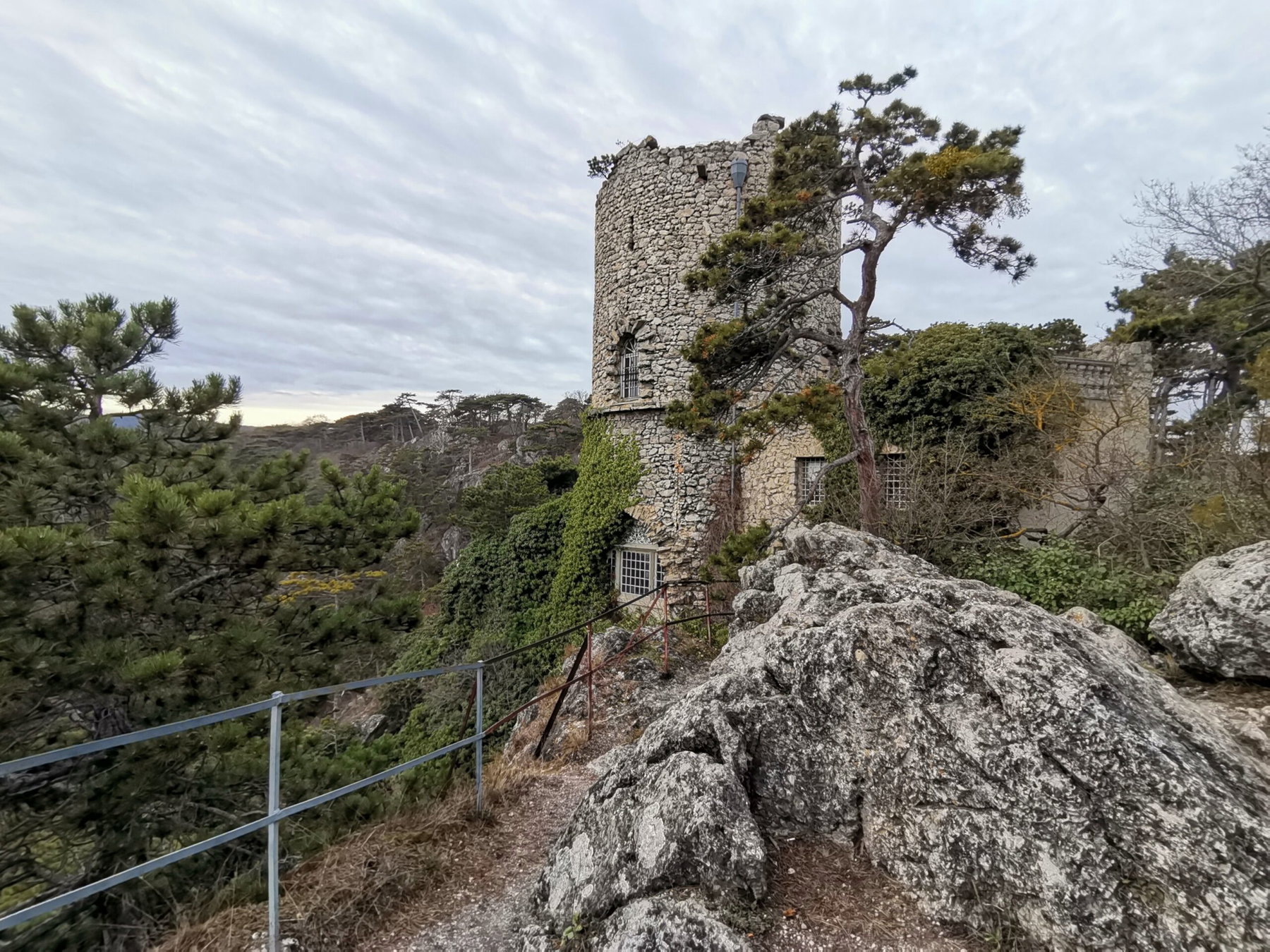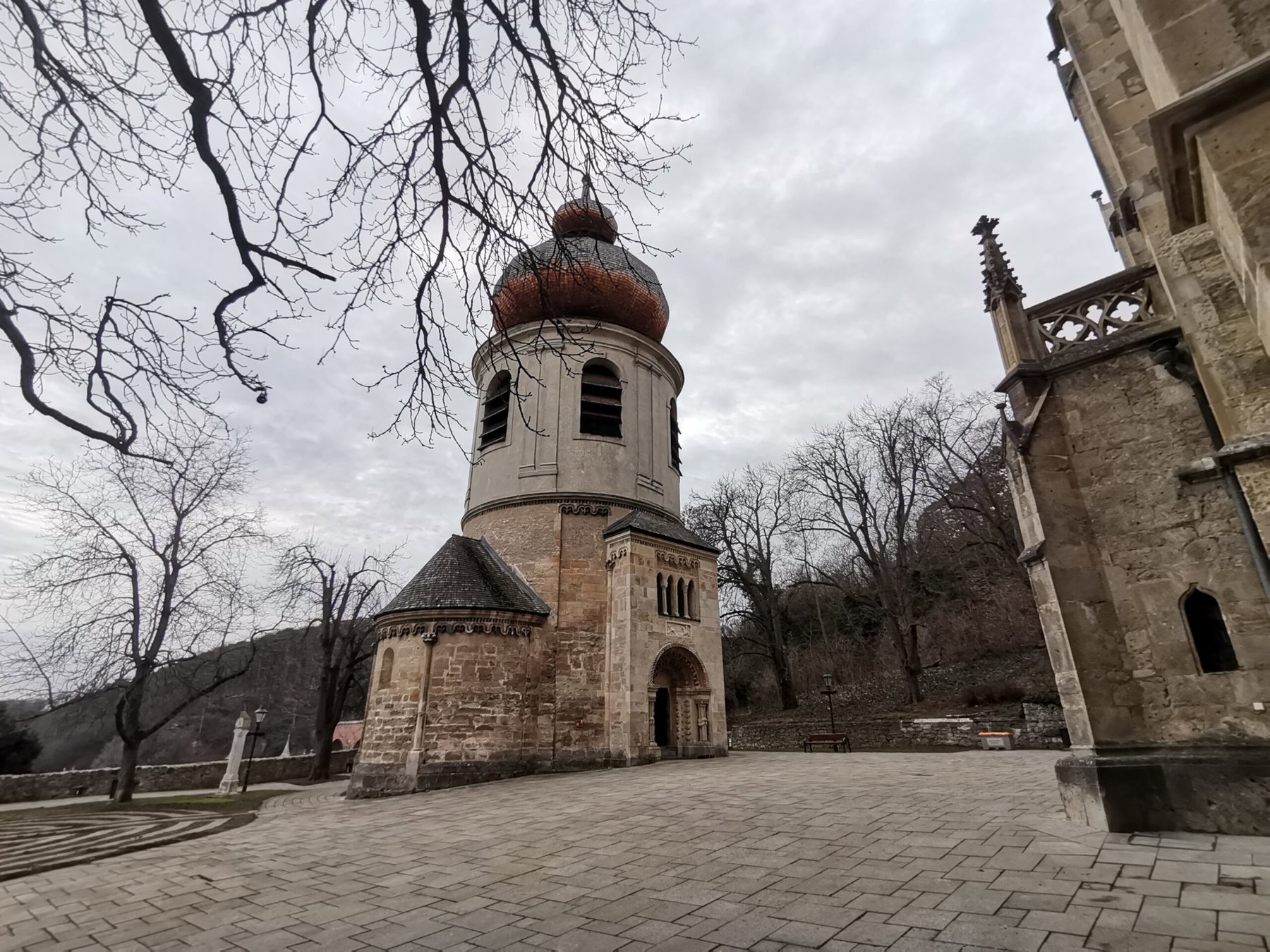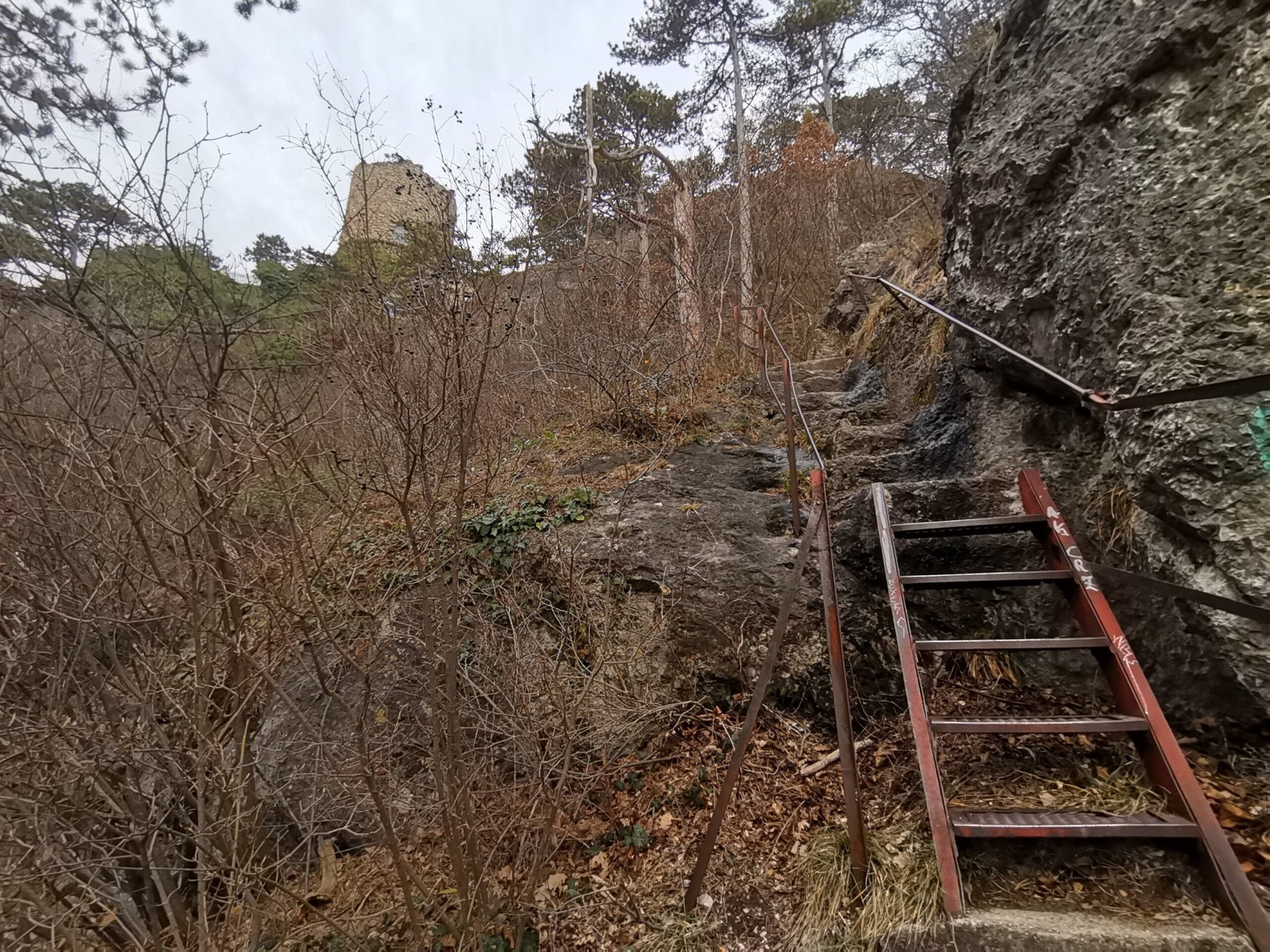 Das Weglein führt direkt zum Schwarzen Turm und zu den Augengläsern, einer kleinen Ruine, durch deren Fenster man einen besonders schönen Blick ins Wiener Becken hat. Über zahlreiche, in den Fels gehauene Stufen (Adlersteig) steige ich zur Kirche St. Othmar hinab. Alle Baumwerke und Weganlagen gehen auf Ideen des sehr romantisch veranlagten Fürsten Liechtenstein zurück.