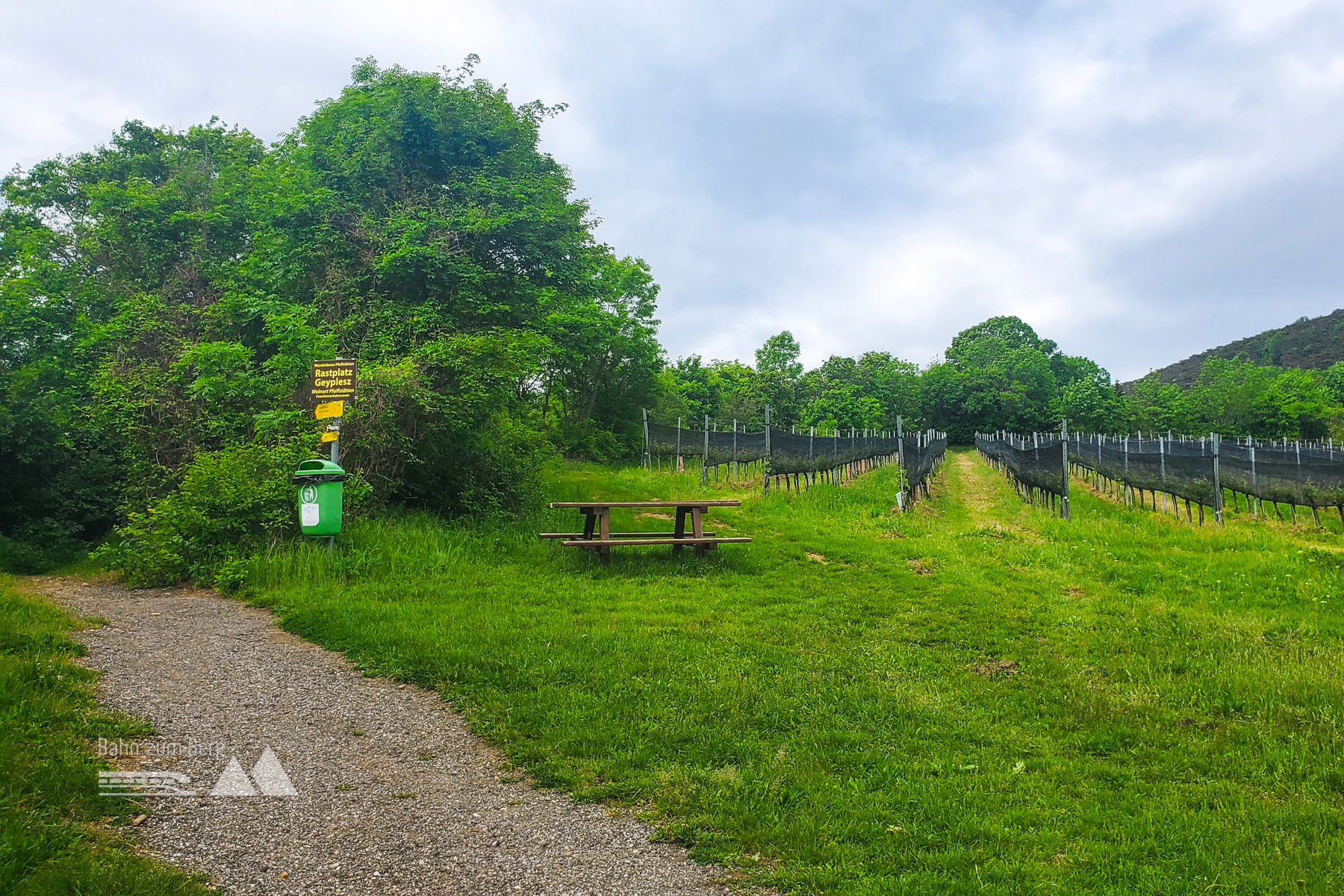 Immer weiter geht es für etwa 800 Meter geradeaus vorbei an Weinbergen. Nach 10 Minuten komme ich zum Rastplatz Geyplesz. Am Rastplatz geht es leicht links vorbei hinauf in einen schmalen dicht bewachsenen Weg.