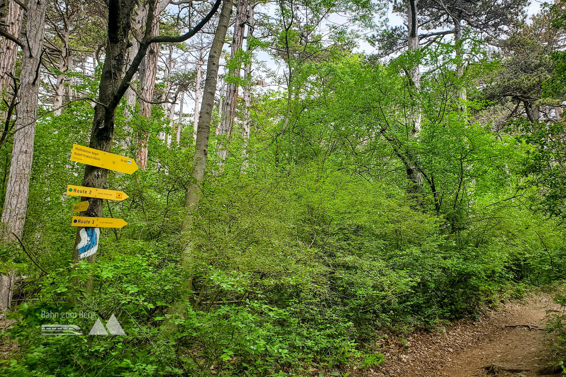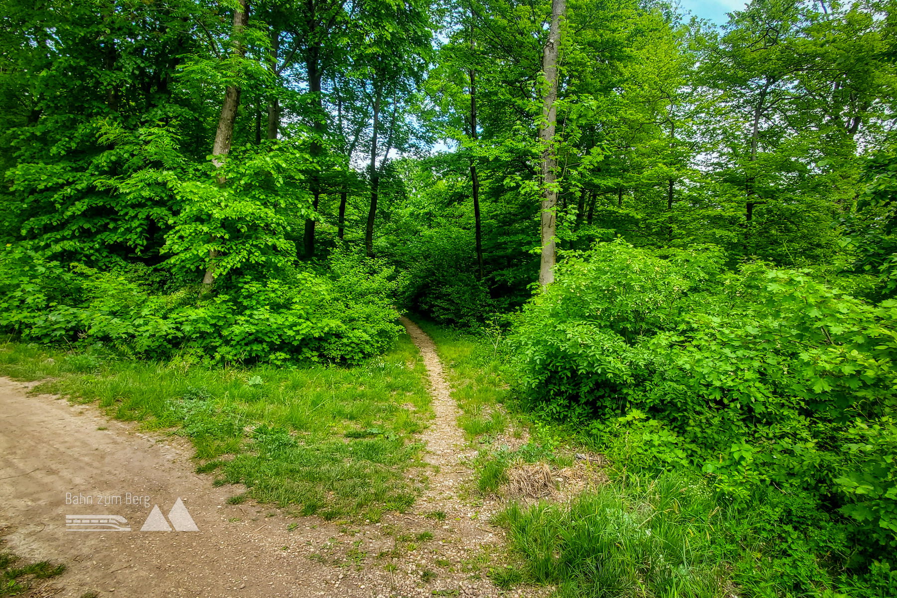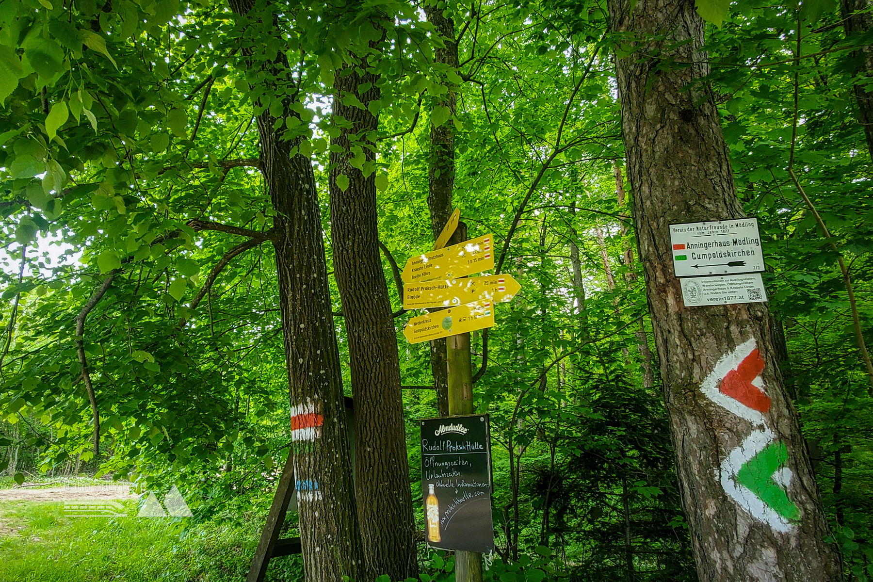 An einer Abzweigung nach etwa 1,3 Kilometern biege ich nach links ab in einen etwas dichter bewachsenen und schmäleren Weg. Bei der nächsten Kreuzung nach etwa 200 Metern biege in nach rechts ab und von hier geradeaus bis zum nächsten Wegweißer, bei welchem ich mich dann leicht rechts halte Richtung Mödling.
