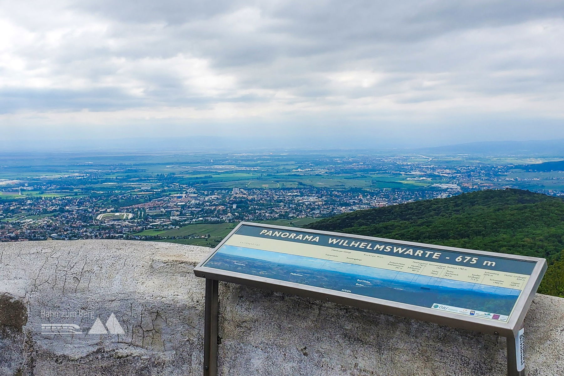 Nach etwa 800 Metern folge ich dem Weg hinauf zur Wilhemswarte. An der Warte angekommen, steige ich die paar Stiegen hinauf und werde ich mit einem Ausblick über Wien bis hin zum Schneeberg belohnt.