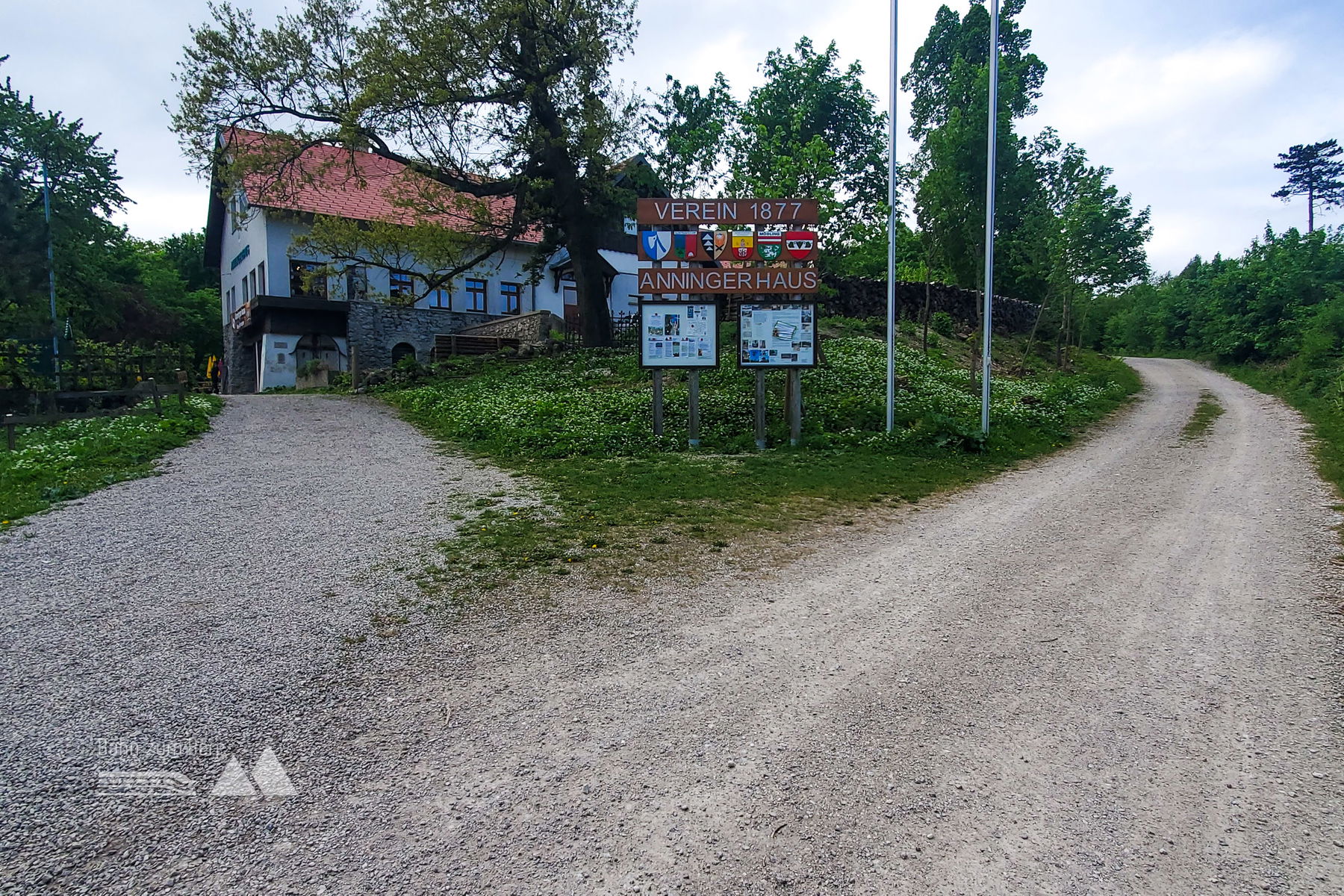 An der Hütte geht es vorbei, hinunter Richtung Anninger und Anninger-Schutzhaus. Für etwa 1,5 Kilometer folge ich dem etwas breiterem Weg bis ich an einer größeren Kreuzung ankomme. Die Kreuzung quere ich leicht rechts und danach halte ich mich zweimal links und folge der Beschilderung Richtung Anninger-Schutzhaus und Anninger.