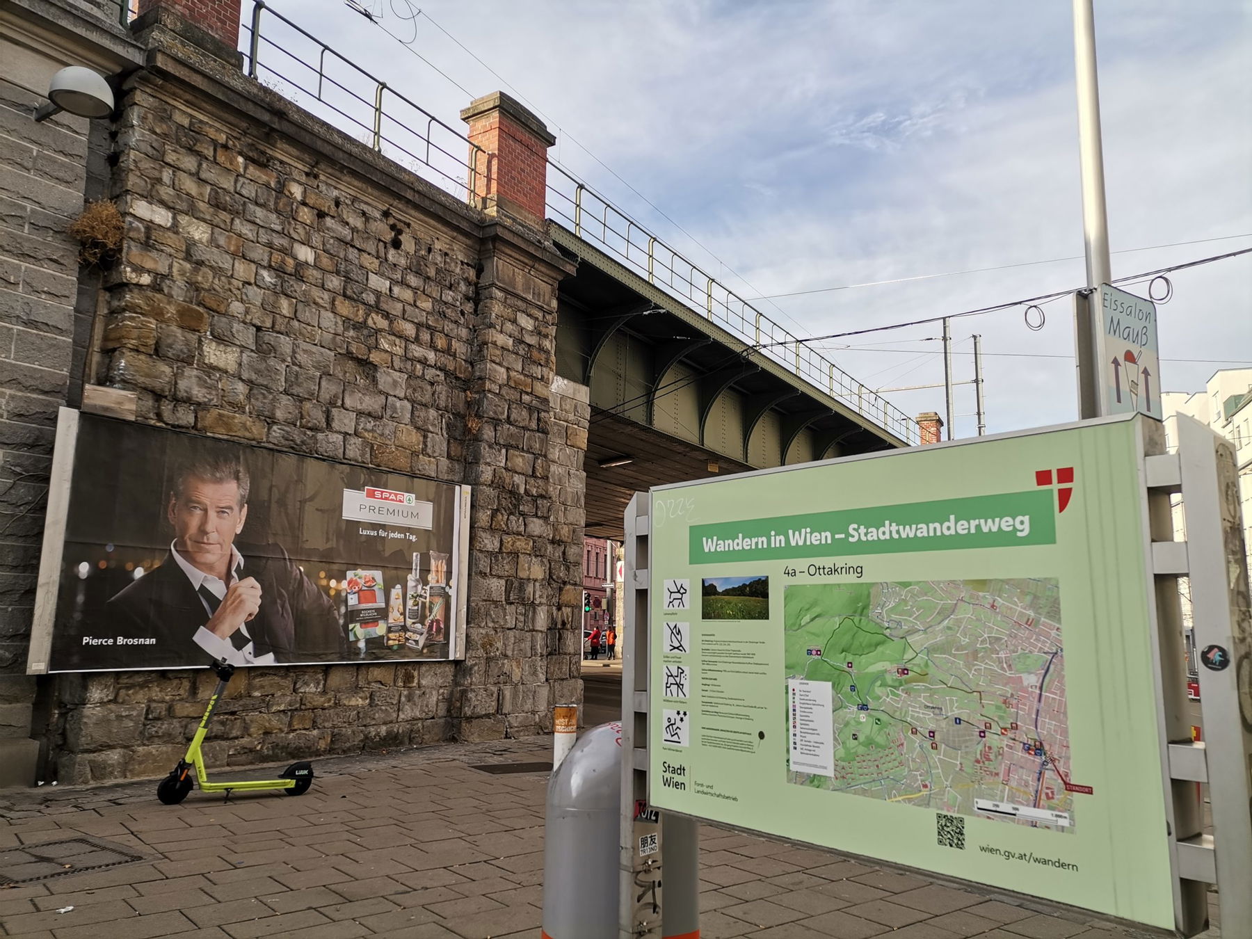 Anfangs ist der Stadtwanderweg 4A bis auf eine Hinweistafel bei der U-Bahn Station Ottakring nicht markiert, aber trotzdem sehr leicht zu finden. Ich verlasse die Haltestelle, begutachte diese Info-Tafel und biege dann nach links in die Thaliastraße ab.