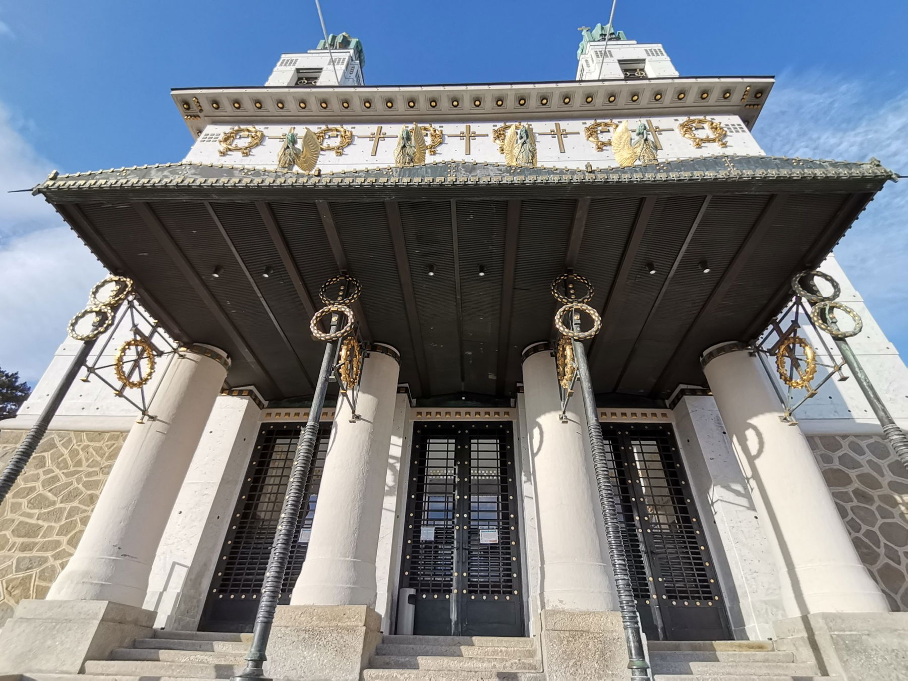 Bei der Feuerwache verlasse ich die Originalstrecke des Stadtwanderwegs und biege nach links in die parkähnlichen, zum Otto Wagner Spital gehörenden Steinhofgründe ab. Ich folge der Forststraße über die weiträumigen, aussichtsreichen Wiesen bis zur Kirche am Steinhof. Zur Zeit ist das Areal des Otto Wagner Spitals mit Bauzäunen abgegrenzt. Wohl wegen der strengen Corona Auflagen. Zur Kirche komme ich aber trotzdem. Diesmal gelingt mir ein Bild nur mit dem Weitwinkelobjektiv der Handykamera, denn der Zaun steht direkt vor der Kirche.