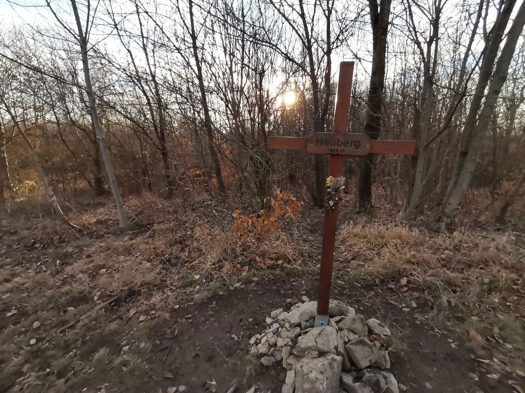 Der Weg würde jetzt Richtung Predigtstuhl weitergehen. Weil ich aber auch gerne ein Gipfelkreuz auf meiner Tour haben möchte, mache ich einen kleinen Umweg und besuche den Heuberg, er ist immerhin 464 m und somit die höchste Erhebung auf dieser Runde. Dann wieder zurück zur Wiese und zum Predigtstuhl am Originalweg.