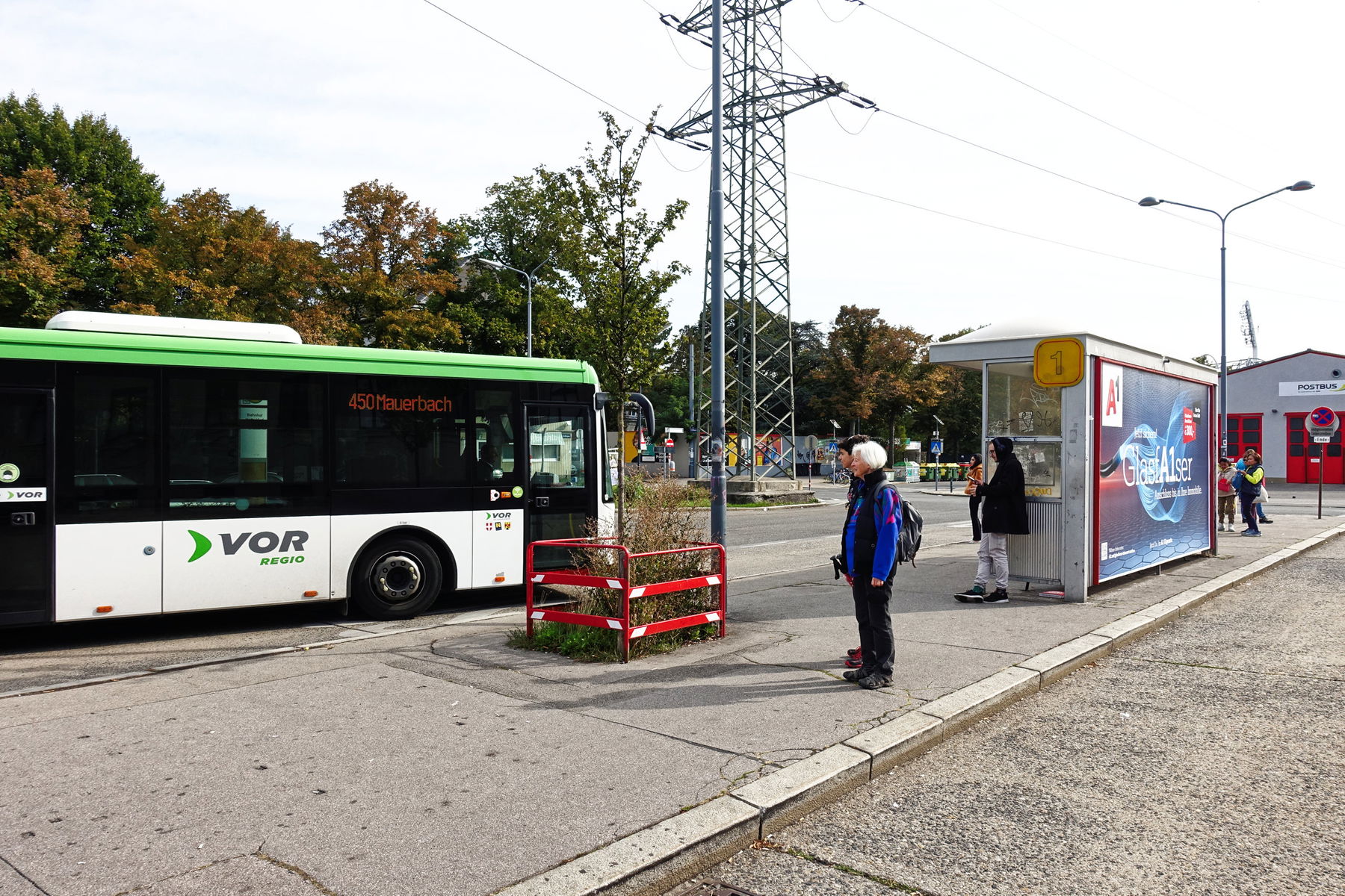 Wir fahren mit der U4 bis zur Endstation Hütteldorf. Dort gehen wir nach Norden auf den Bahnhofsvorplatz hinaus um in den Bus 450, auf Busplattform 1, einzusteigen.