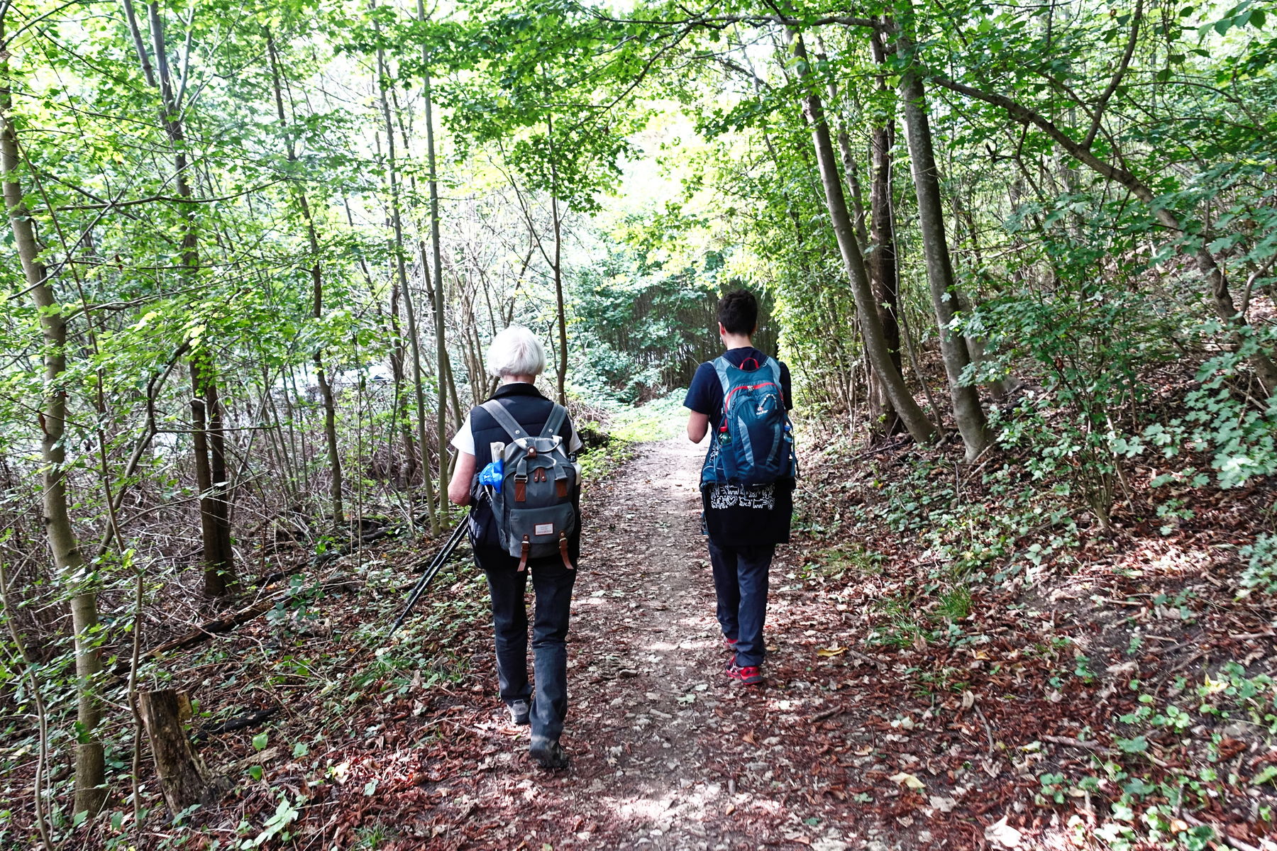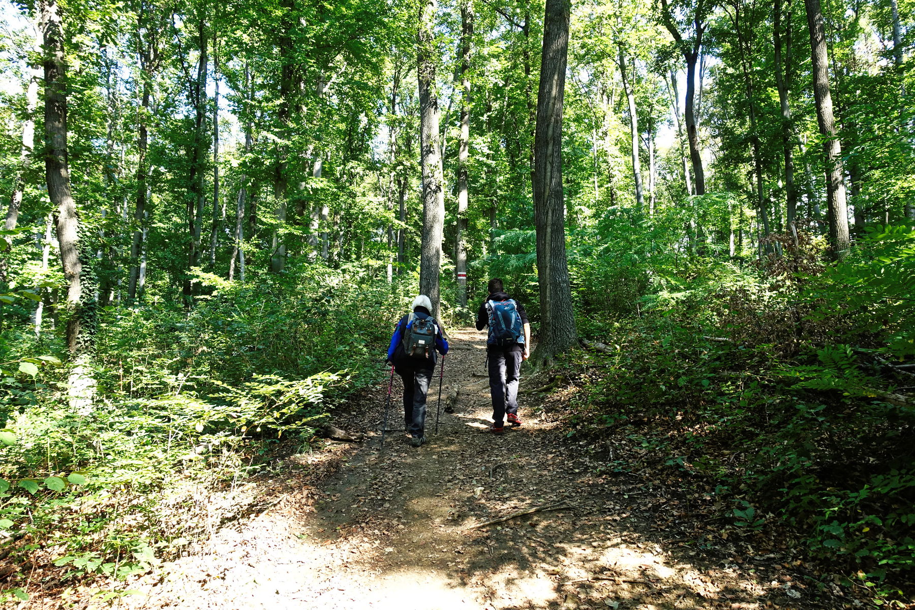 Anfang geht es relativ steil hinauf, auf den Kreutberg (449m). Neben unserem Wanderweg, verläuft eine ausgefahrene Bahn – eine Downhill-Strecke für Mountainbiker, die wir immer wieder bei ihrer rasanten Talfahrt beobachten können.