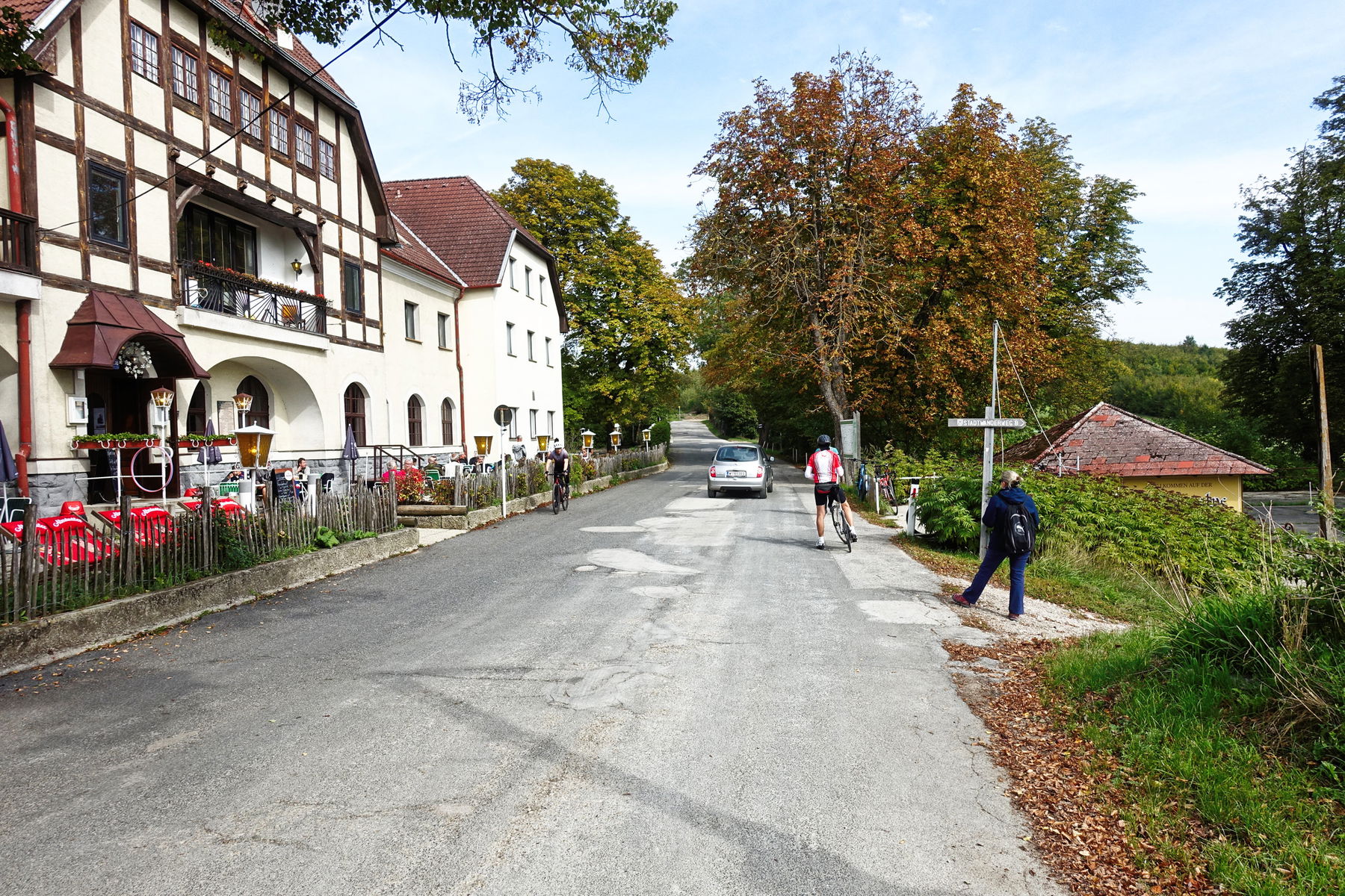 Von der Mostalm folgen wir einem Schotterweg, der für uns leicht bergauf führt, bis zur Sophienalpe (477m). Hier kommen uns laufend Mountainbiker, in teilweise hoher Geschwindigkeit, entgegen, die offenbar zur Downhillstrecke unterwegs sind.