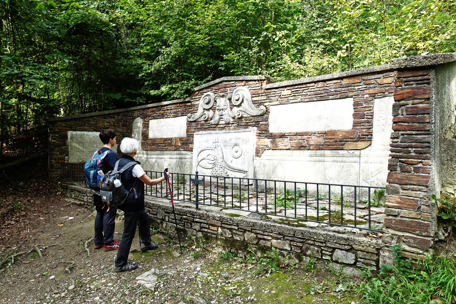 Zurück am Standwanderweg, kommen wir zu den Türkensteinen. Türkische Marmortafeln, die der Feldherr Gideon Laudon, nach seinem Sieg über die Türken in Belgrad mitgebracht hat. Man kann sie auf einer Natursteinwand angebracht sehen.