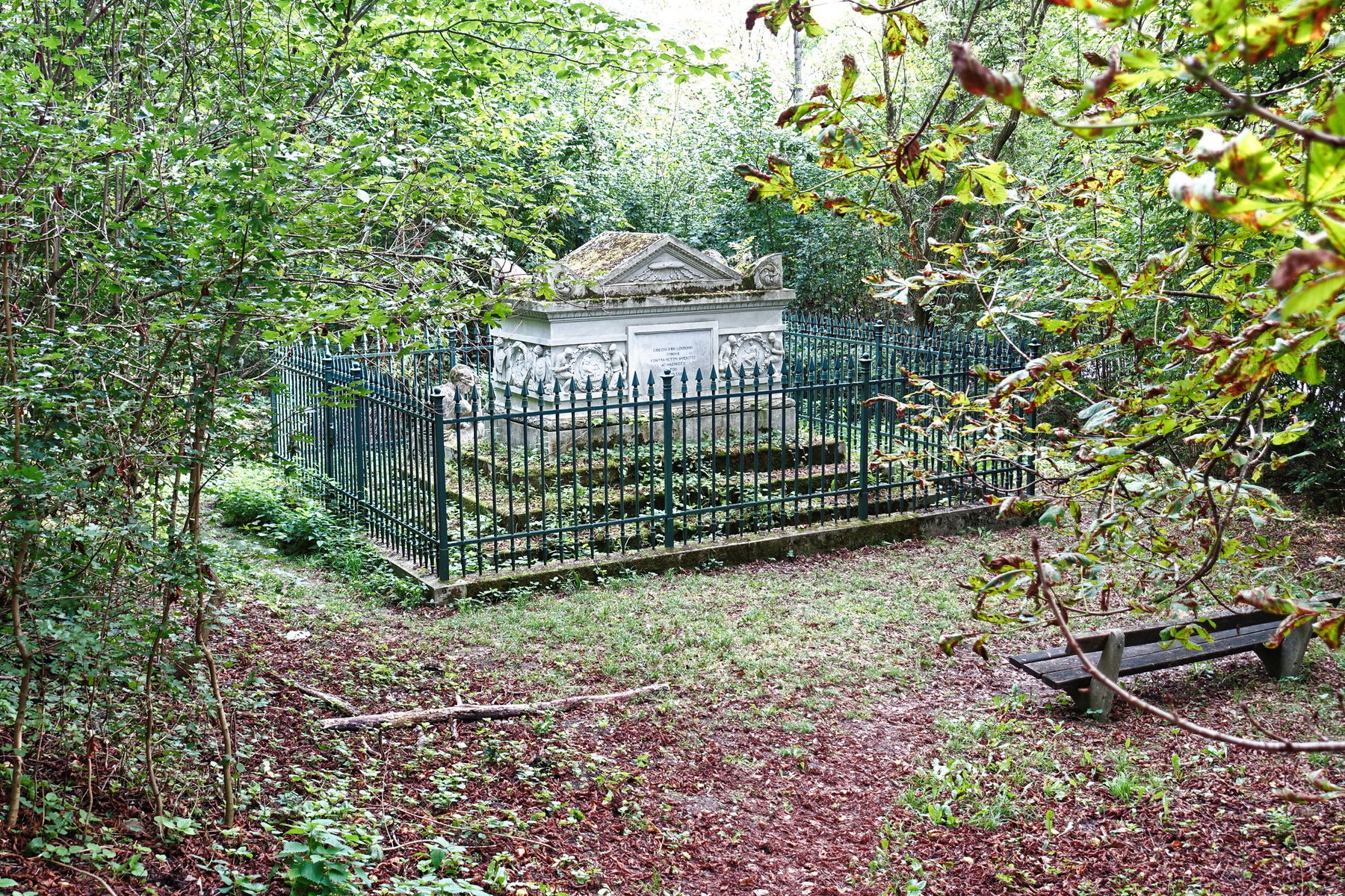 Wir zweigen an der Hinweistafel zu den Laudongräbern vom Stadtwanderweg 8 ab und erklimmen den nahen Waldhügel. Oben finden sich zwei schlichte Grabplatten, umfriedet von einem schmiedeeisernen Zaun.