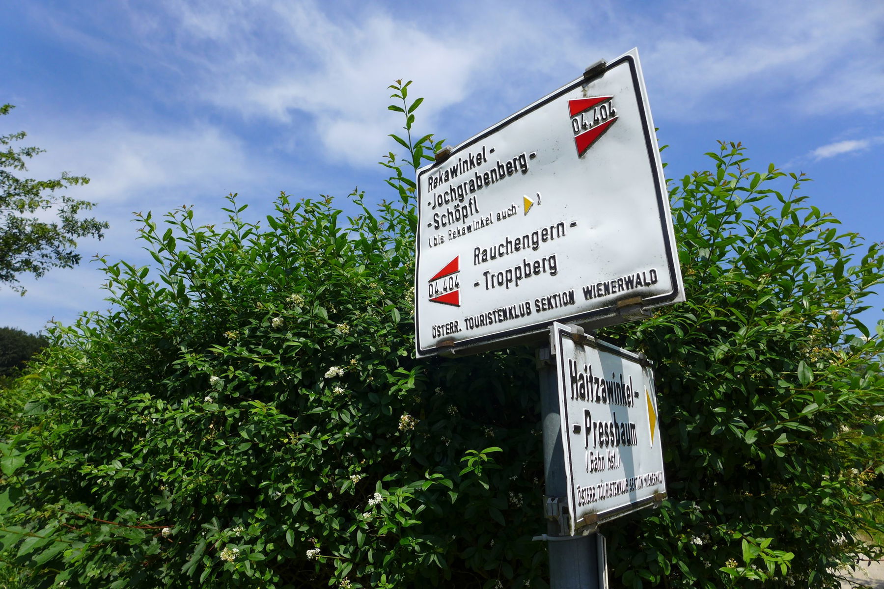Zurück zum bunten Wegweiser, und rechts weiter mit blauer und bald auch roter Markierung am Weitwanderweg 404 Richtung Rekawinkel. Nach einem Abstieg am Waldrand (links „Jaus’n auf der Alm“) großteils eben am Waldrücken entlang zum Wienerwaldhof (ehemaliges Gasthaus Rieger). Kurz davor befindet sich eine Naturwaldzelle mit über 200-jährigen dickstämmigen Buchen. Jenseits des Sattels Überschreitung des Heinratsberges über eine bald recht breite Waldschneise. Danach nette Ausblicke am folgenden Wiesenrand. Nach dem Hinteren Steinberg eine Landstraße kreuzen und vorbei am „Almstüberl“. Waldreich geht es dann Richtung Rekawinkel über den Kleinen und Großen Stiefelberg hinweg. Die folgende Wiese „Am Hagen“ gewährt wieder schöne Fernblicke. Ab einem Anwesen auf eine Forststraße zu einer Schneise, über die eine Starkstromleitung verläuft. Schräg links im Dickicht mit gelber Markierungen weiter Richtung Bahnhof Rekawinkel. Dorthin auf der Forsthausstraße durch eine Siedlung, dann über die Landstraße zum Ziel der Wanderung. Die Gehzeit vom Troppberg bis hierher beträgt 2 ½ Stunden.