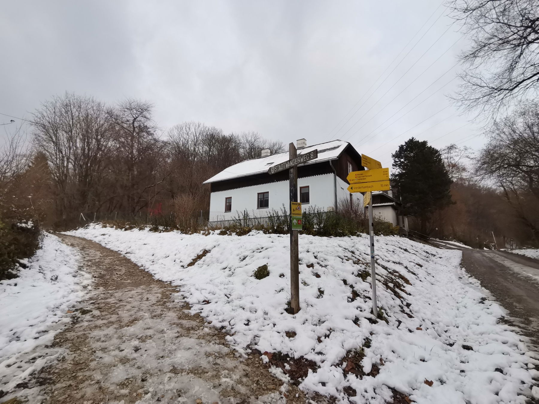 Übers Rote Kreuz (497m) mit der Richtfunkstation Exelberg gelange ich zur Exelbergstraße, diese überquere ich. Beim kleinen Parkplatz weiter auf dem Forstweg zum Hameau oder Holländerdörfl, also ein kurzes Stück auf dem Stadtwanderweg 3, erreiche ich schließlich den Dreimarkstein. Hier befindet sich das Häuserl am Roan. Der kleine Löschteich am Weg dorthin ist tatsächlich zugefroren.