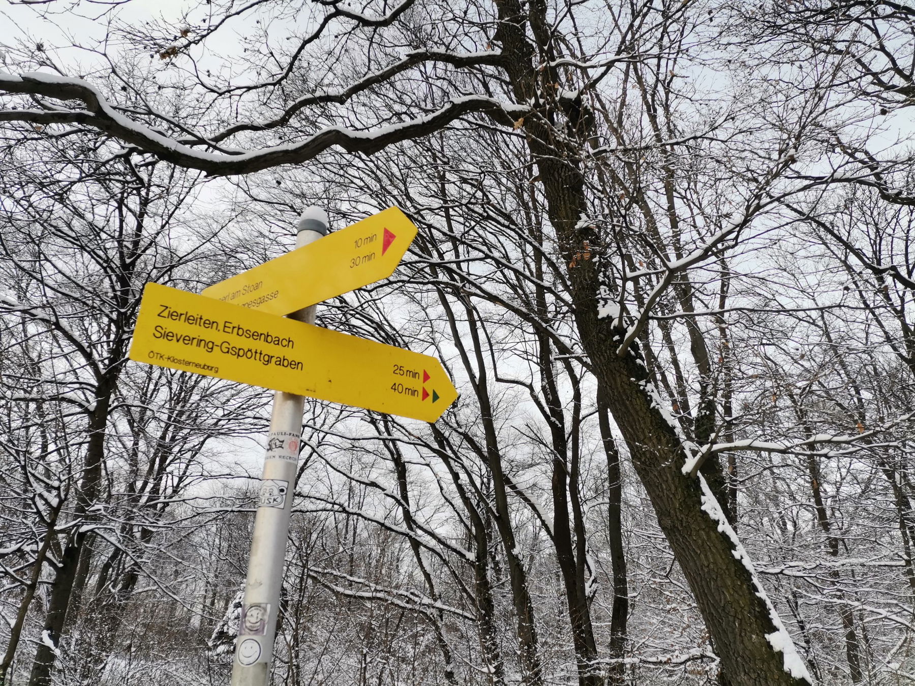 Vom Dreimarkstein gehe ich oberhalb des großen Parkplatzes zuerst Richtung Häuserl am Stoan, biege aber nach kurzer Zeit nach links ab, hinunter zum Erbsenbach, über die Zierleiten nach Sievering.