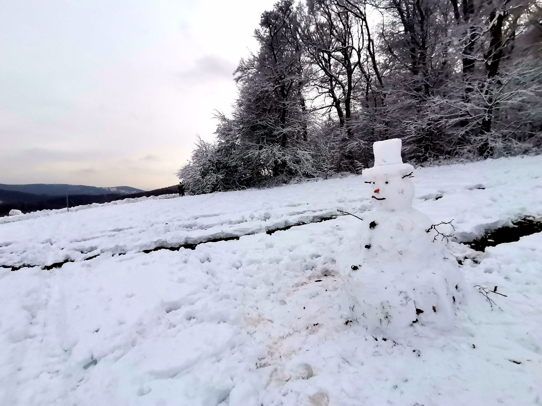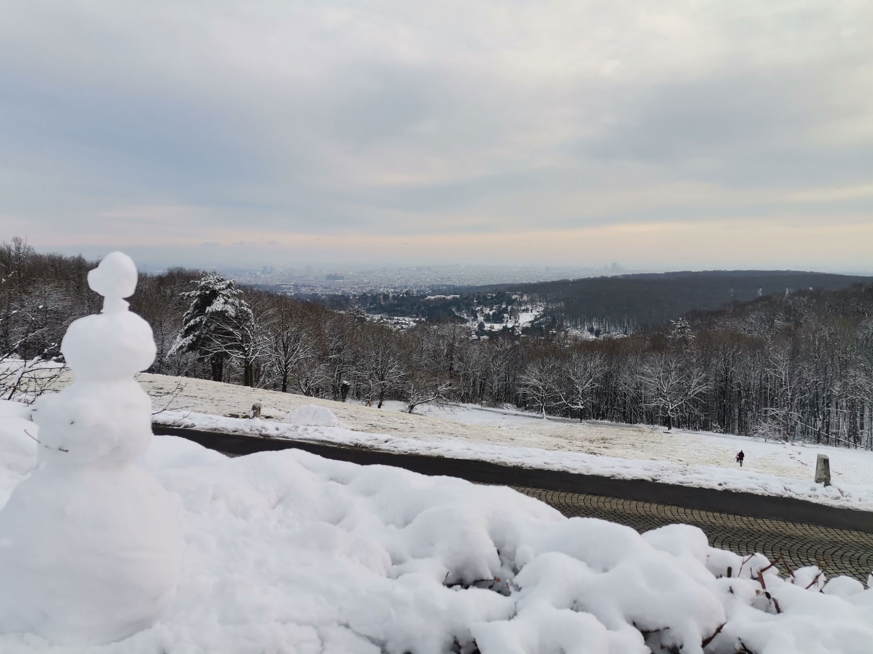 Weiter gehts, begleitet von zahlreichen Schneemännern zur Franz-Karl-Fernsicht (488m). Mein Blick schweift über Wien, den Wienerwald, die Gutensteiner Alpen bis hin zum Schneeberg. Auch einen Langläufer entdecke ich auf der Wiese.