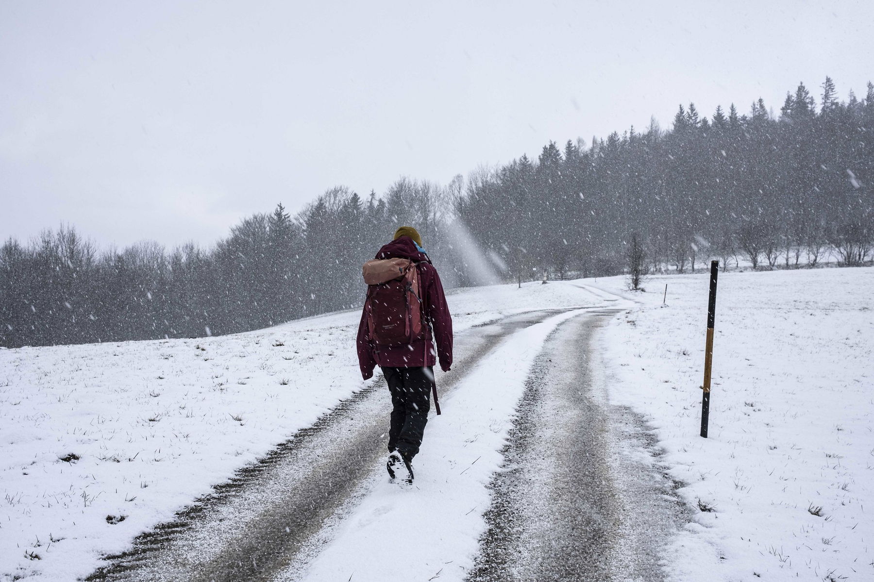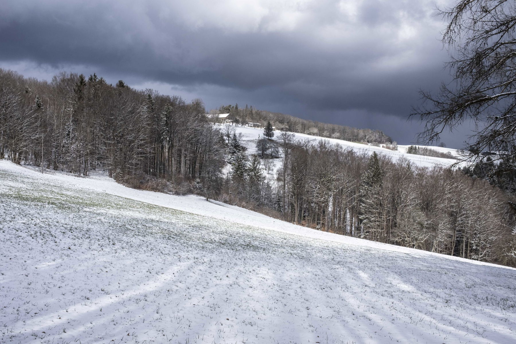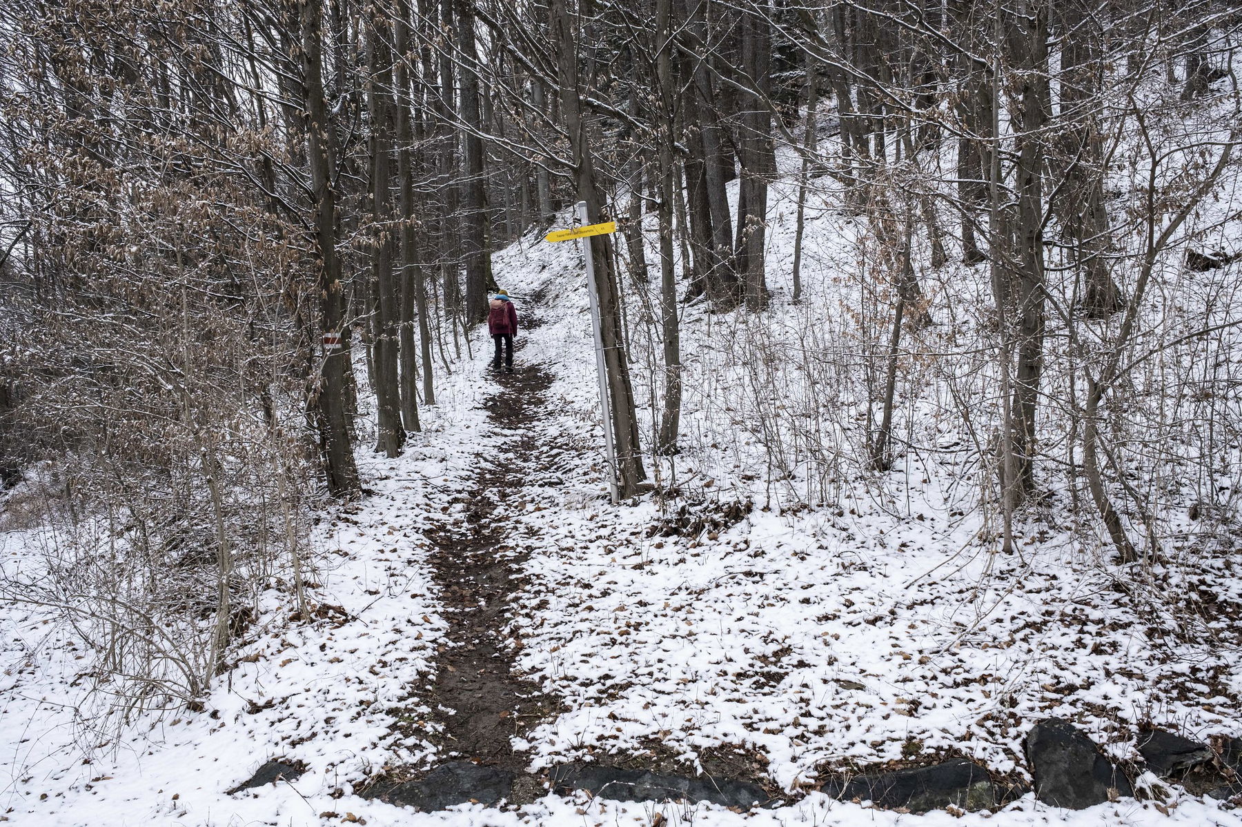 Es hat leicht geschneit, aber anfangs ist es etwas gatschig und bei der Steigung wird uns gleich warm. Wald und Wiesen wechseln sich ab, wie noch öfter auf der geplanten Route.