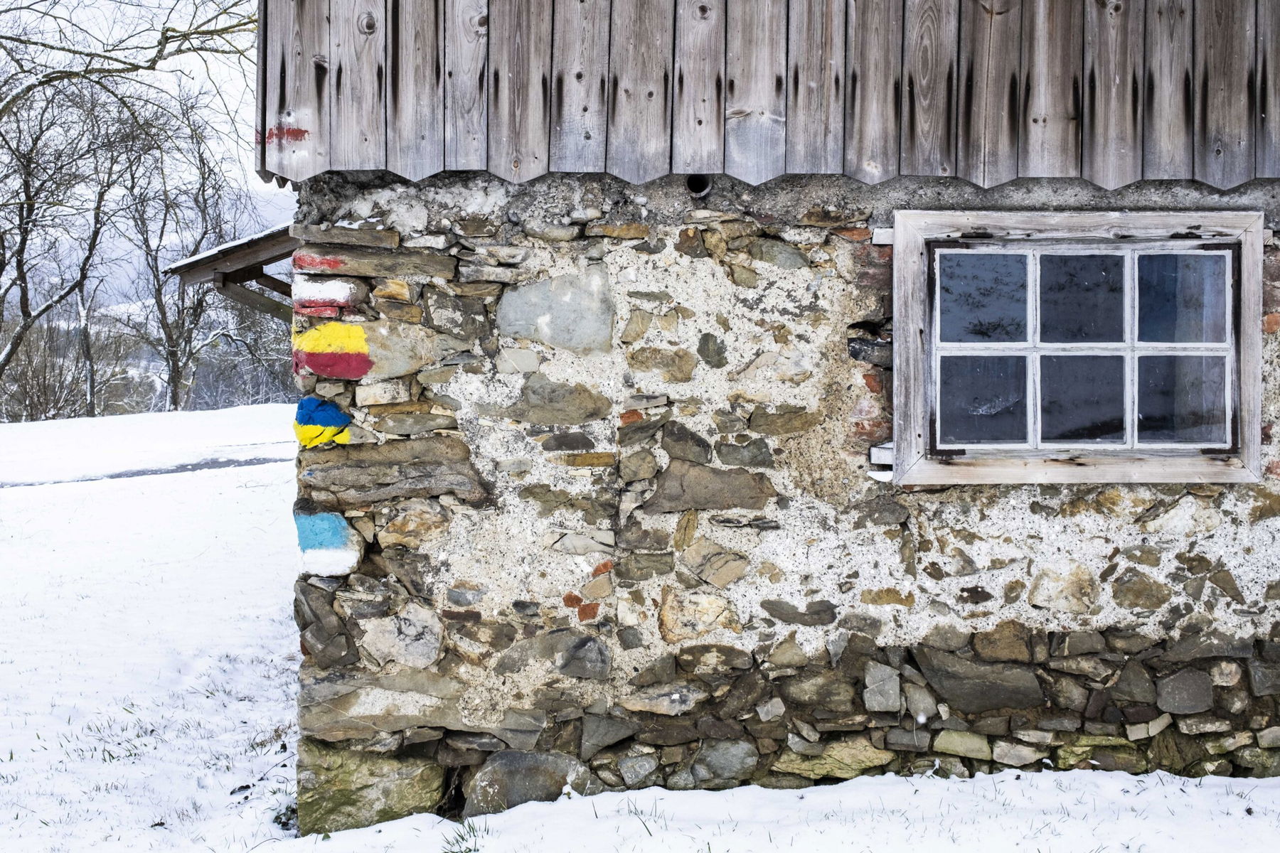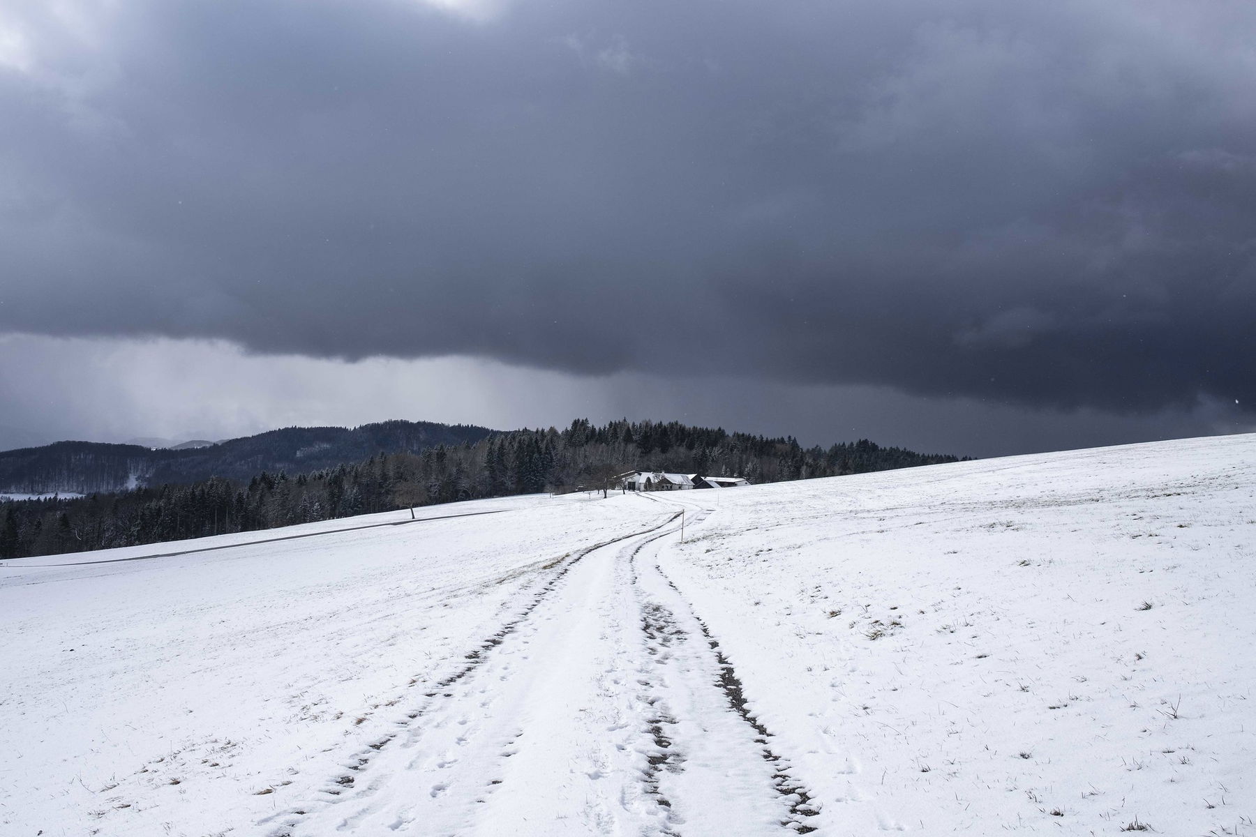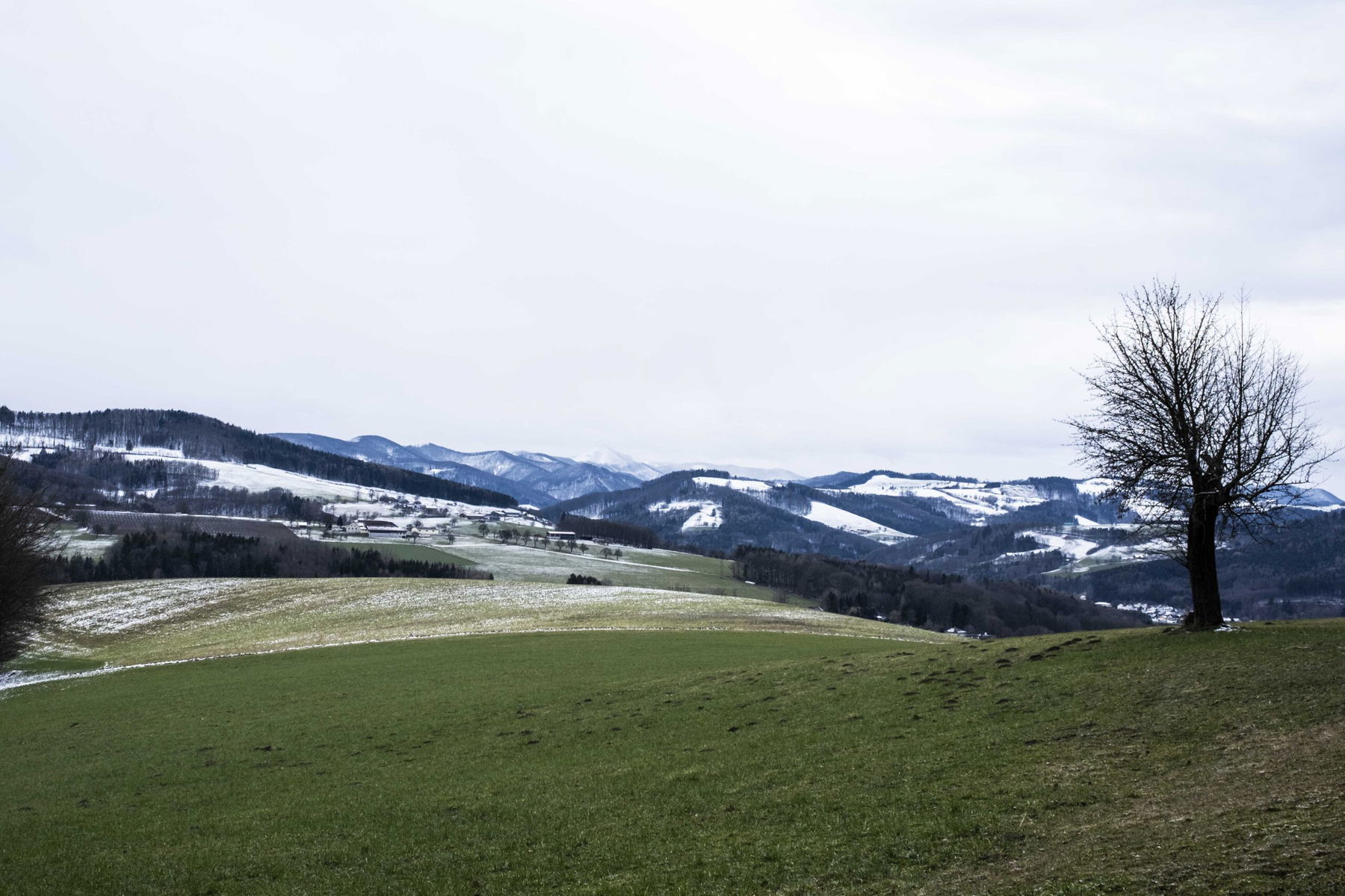 Es hat leicht geschneit, aber anfangs ist es etwas gatschig und bei der Steigung wird uns gleich warm. Wald und Wiesen wechseln sich ab, wie noch öfter auf der geplanten Route.