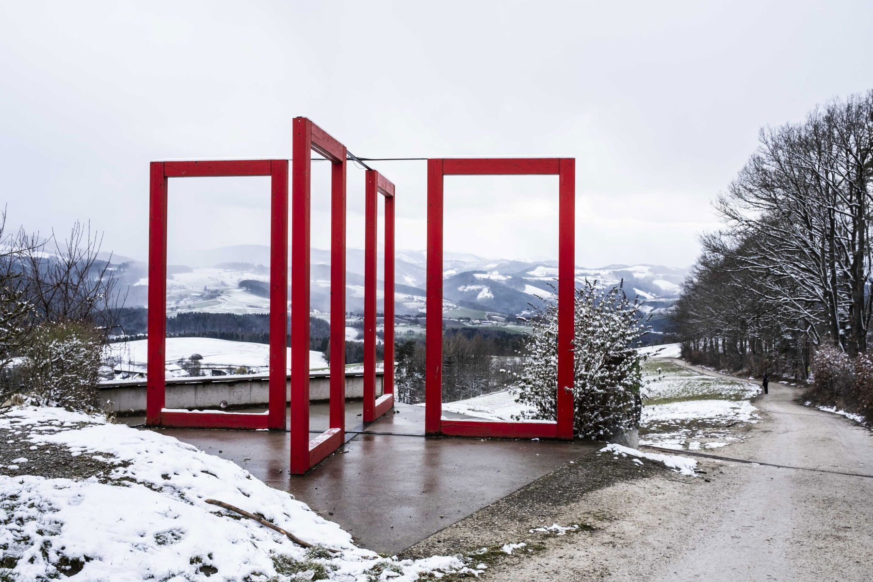 Neben der Hütte befindet sich ein Gipfelkreuz der etwas anderen Art – vier rote Rahmen, kreuzförmig auf einer Betonfläche montiert. Ich finde leider keine Infos, von wem das Kunstwerk stammt. Wir sind nicht die einzigen, die sich in die Rahmen reinstellen und Fotos machen. Die Aussicht von dort oben ins Alpenvorland ist wunderbar!
