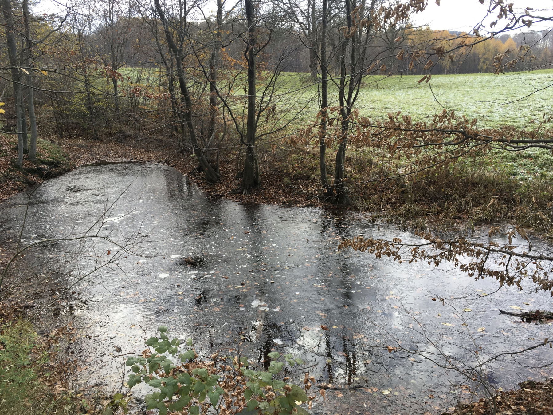 Während einer winterlichen Familienwanderung hüpfte mein Onkel auf der gefrorenen Eisfläche dieses Tümpels herum, um uns zu beweisen, wie tragfähig das Eis schon wäre, (der Onkel jenseits der hundert Kilo). Unser kleiner Cousin Andreas traute sich als erstes von uns Kindern aufs Eis.