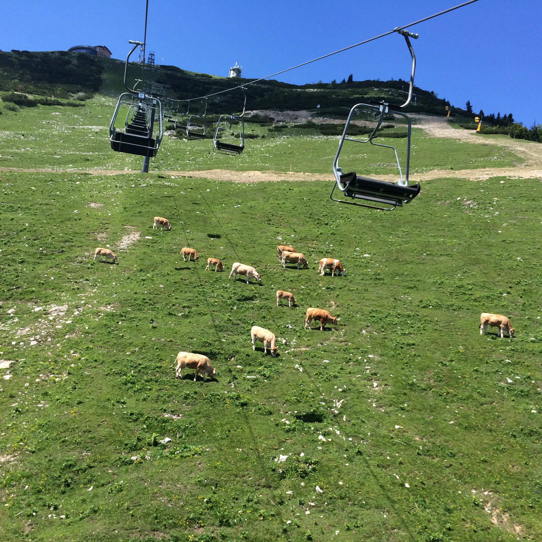 Im Sommer befinden sich einige Kühe auf der Alm. Sie sind sehr friedlich, wie bei allen Begegnungen mit Tieren sind einfach Respekt und Hausverstand gefragt – also ganz normal mit ausreichend Abstand vorbeigehen, die Tiere nicht bedrängen oder durch hektische Bewegungen oder lautes Schreien reizen.