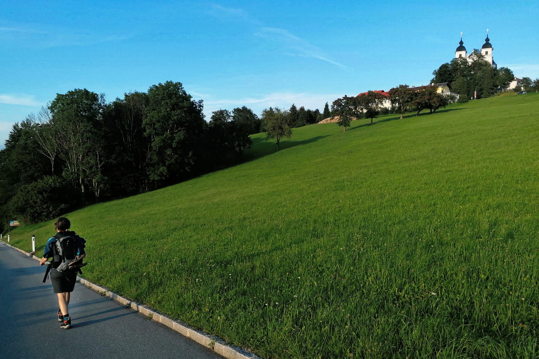 Die meiste Zeit geht es jetzt auf der Straße weiter: Über den Kogel (712m), auf dem sich ein schöner Pausenplatz und eine interaktive Station mit Meditationsgongs befindet, geht es immer der Nase nach in Richtung Sonntagberg. Die Wallfahrtskirche dort blitzt immer mal wieder vor uns auf, ansonsten werden wir begleitet von grünen Hügeln, Gehöften und glücklicherweise kaum Verkehr.